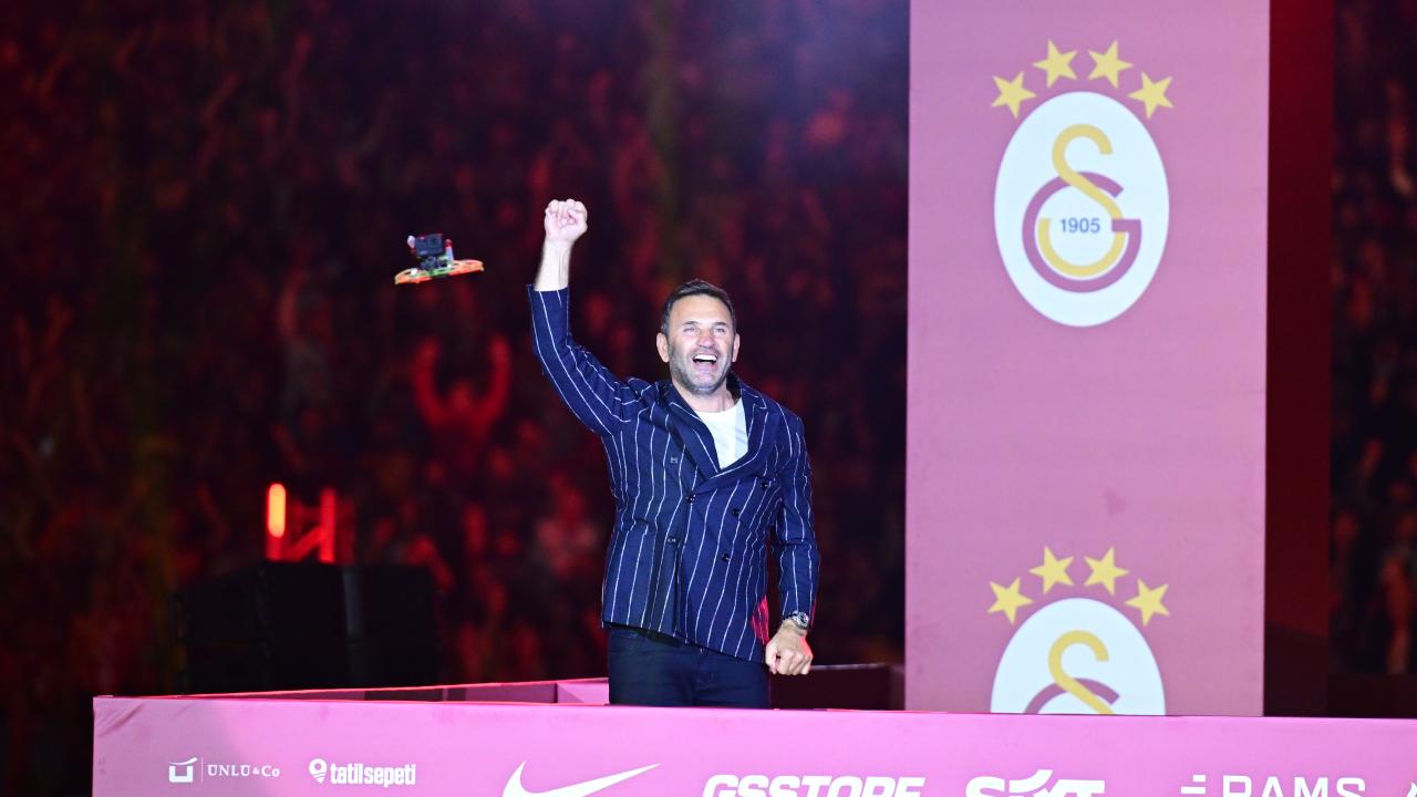 İlk olarak futbol takımı idari ekibi ve kulüp personelleri, ardından da teknik ekip tek tek sahneye çağırıldı. Alkışlar ve tezahüratlar arasında podyuma gelen teknik direktör Okan Buruk`a oğlu Ali Yiğit de eşlik etti. Buruk, kendisine sevgi gösterisinde bulunan tarafarlarla "üçlü" tezahüratı yaptı.