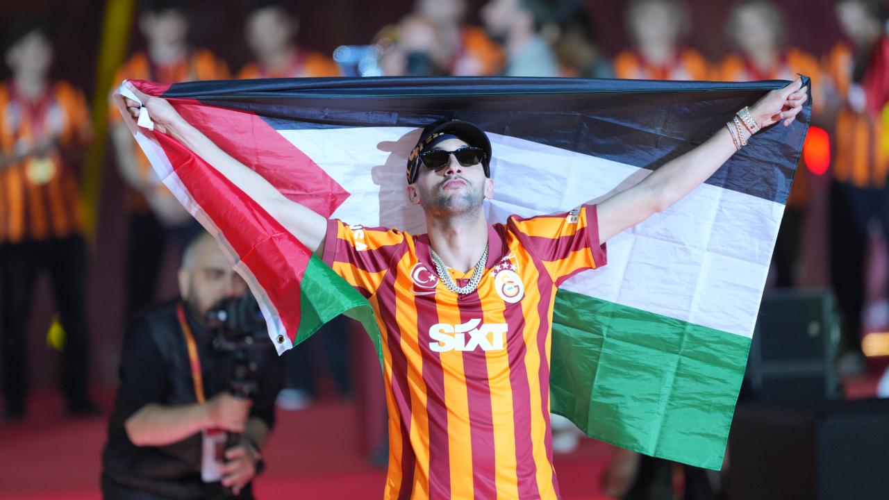 Futbolcular podyuma çağrıldığı sırada Faslı yıldız Ziyech, Filistin bayrağı taşıdı.