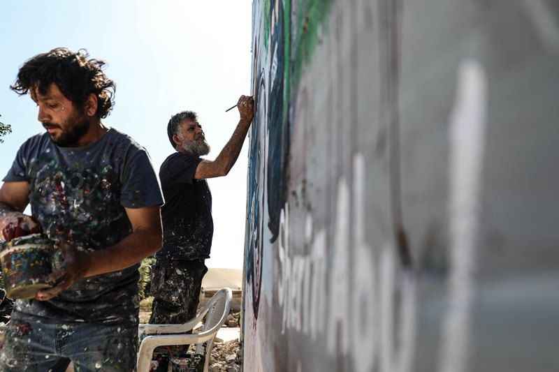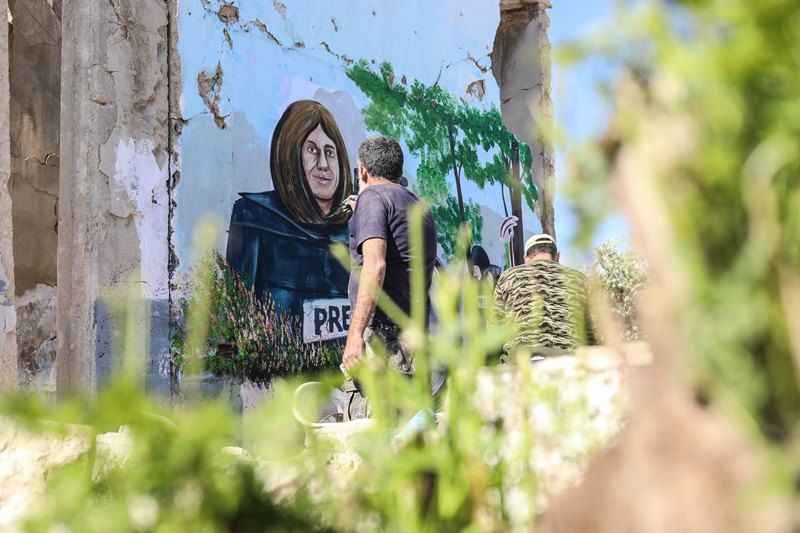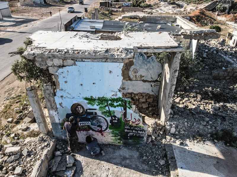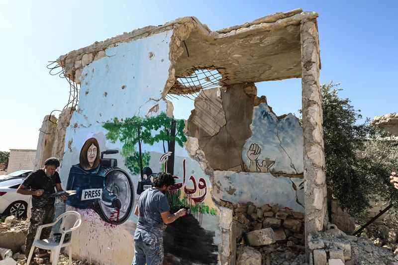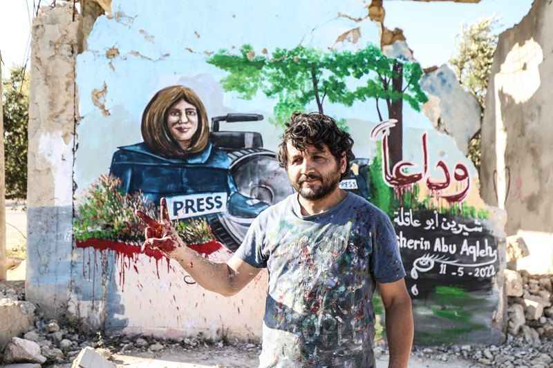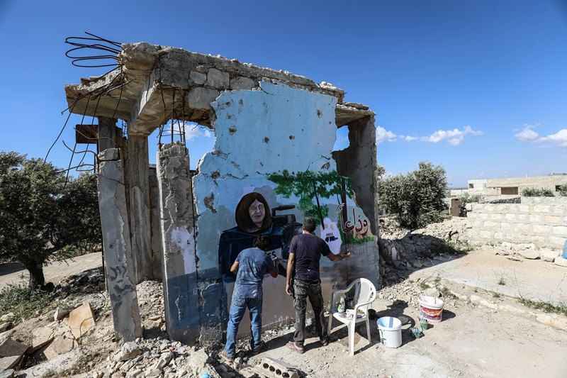Sanatçı Esmer, yıkıntılar içindeki bir duvara bu kez de işgal altındaki Batı Şeria'nın Cenin Mülteci Kampı'nda İsrail askerleri tarafından açılan ateş sonucu hayatını kaybeden gazeteci Şirin Ebu Akile'nin resmini yaptı.