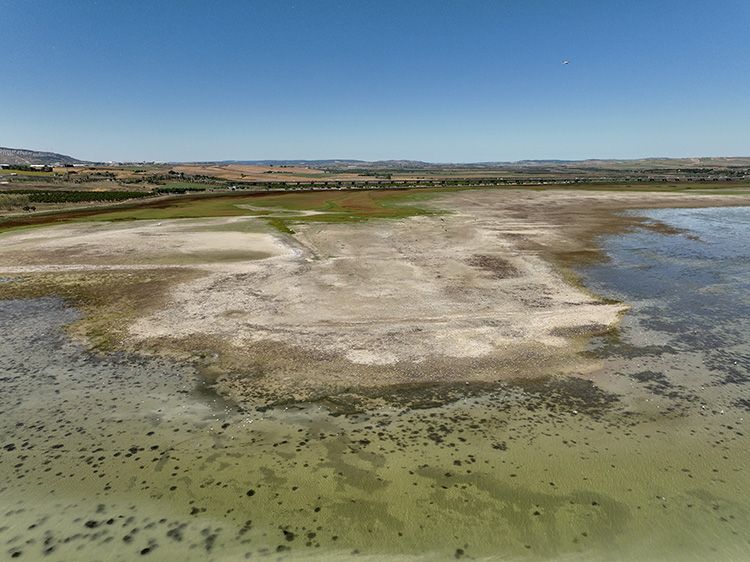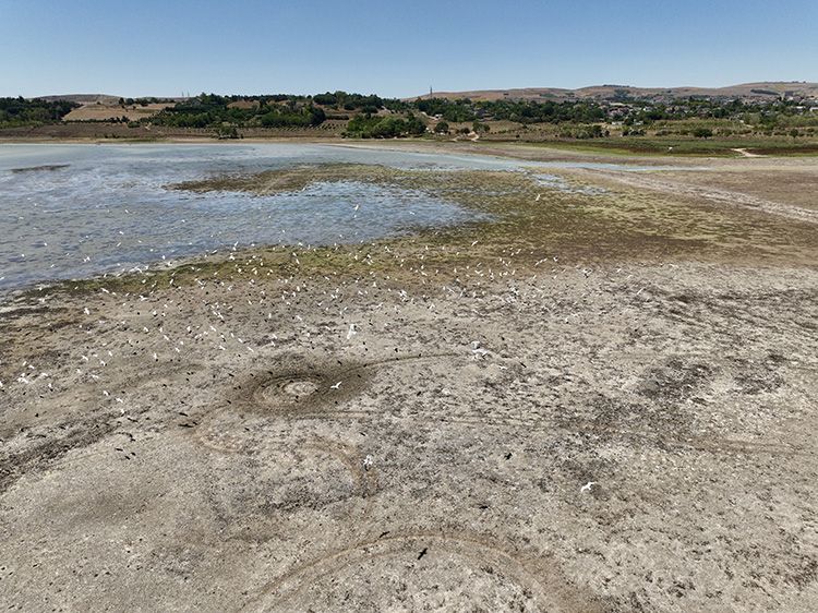 Suyu çekilen Büyükçekmece Gölü'nde kurumanın başladığı gözlendi