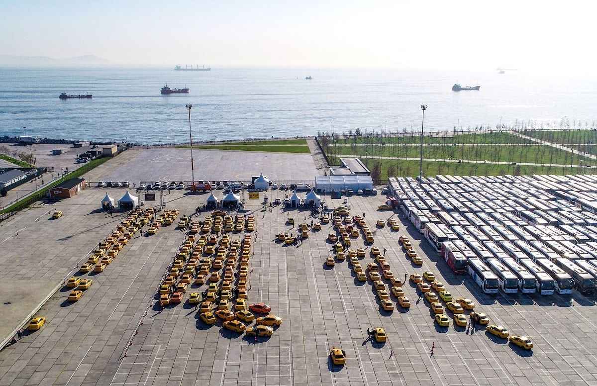Taksimetrelerini güncellemek için Yenikapı'daki etkinlik alanına gelen çok sayıda taksici uzun kuyruk oluşturdu.