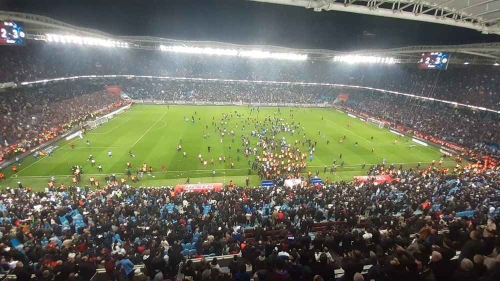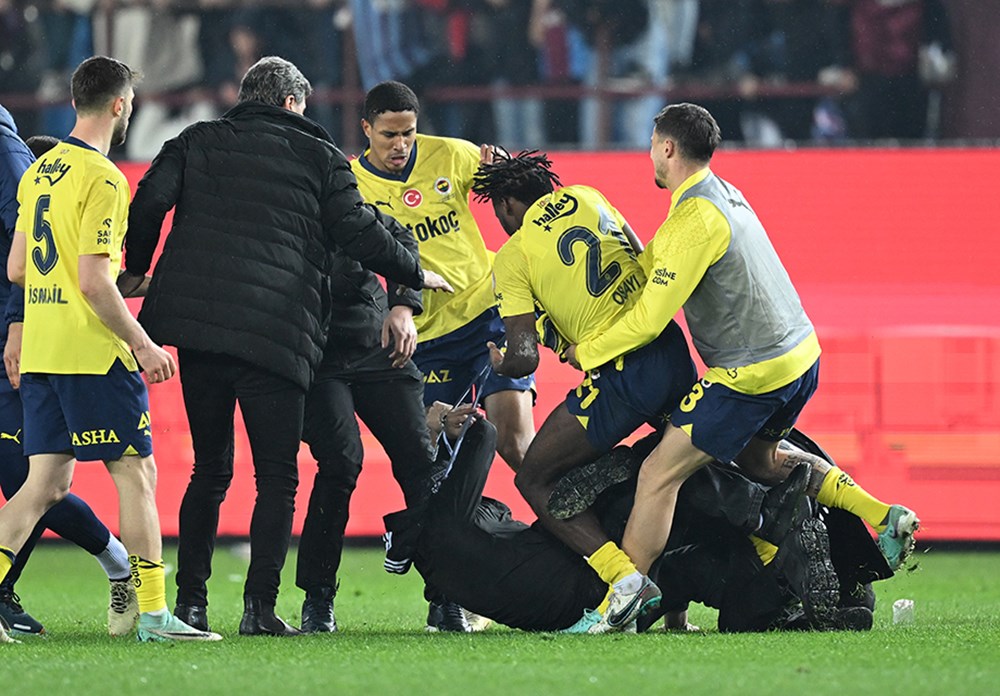 Trendyol Süper Lig'in 30. haftasında oynanan Trabzonspor - Fenerbahçe maçı bitiş düdüğüyle birlikte bordo-mavili taraftarlar sahaya girdi. Taraftarlar, Fenerbahçe futbolcularına saldırdı. İşte o anlar...