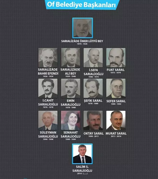 Trabzon’da tarihi çok eski yıllara dayanan Of ilçesi belki de Türkiye’ye hiç örneği olmayan bir özelliği ile dikkat çekiyor. 1874 yılında kurulan Of Belediyesi’nde Sarıalizade Ömer Lütfü Bey’in 52 süren belediye başkanlığı görevinin ardından ilçe belediyesi hep ‘Saral’ ailesi tarafından yönetildi. 150 yıldır bozulmayan gelenekte ilçede 14 kez belediye başkanlarının isimleri değişse de soyadı hep aynı kaldı. Karadeniz'de göreve gelen ikinci kadın belediye başkanı olan Semahat Sarıalioğlu 1998-1999 yılları arasında görev yaptığı ilçede 30 Mart 2014 yerel seçimlerinden sonra belediye başkanlığı görevini sürdüren Salim Salih Sarıalioğlu tekrar AK Parti’den aday olarak gösterildi. İlk belediye başkanının torunu olan Salim Salih Sarıalioğlu’nun ilçe belediyesi için rakiplerinin çoğunluğu da 'Saral' soy isimli adaylar oldu.