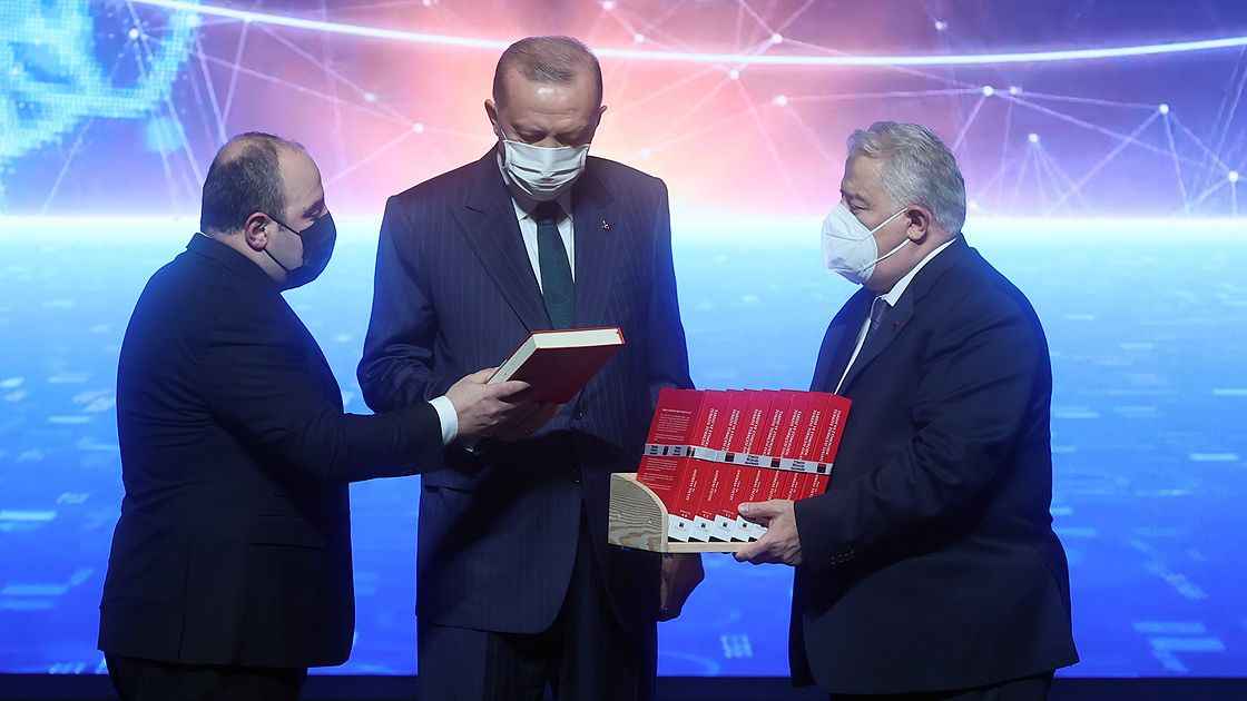 Sanayi ve Teknoloji Bakanı Mustafa Varank ve Hasan Mandal, TÜBİTAK tarafından hazırlanan, baş editörlüğünü Cumhurbaşkanı Başdanışmanı Prof. Dr. Yekta Saraç'ın yaptığı 4 ciltlik "Sosyal Bilimler Ansiklopedisi"ni, Erdoğan'a arz etti.