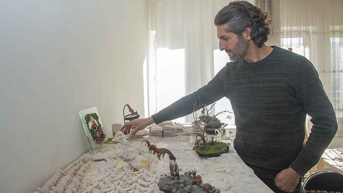 Haftanın belirli günlerinde atölyesine gelen Sağol'un yaptığı eserler arasında ise en çok dikkati çekenler arasında yaban keçileri ve kekliklerin minyatürleri yer alıyor.