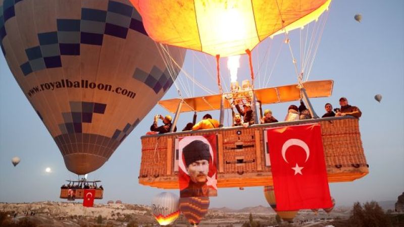 Kapadokya'da, sıcak hava balonları, Cumhuriyet'in 100. yılı dolayısıyla Türk bayrakları ve Atatürk posterleriyle uçuş gerçekleştirdi. Gün doğumu vaktinde onlarca sıcak hava balonu, Nevşehir'in Göreme beldesinden gökyüzüne yükseldi.