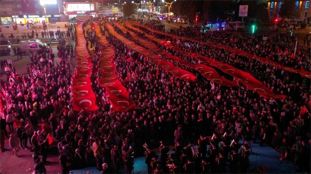 Katılımcıların ellerinde Türk bayrağı ve fenerlerle yürüdüğü etkinlikte 100 metrelik Türk bayrağı taşındı.
