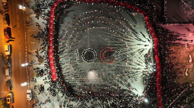 Gaziantep'in Nizip ilçesinde Cumhuriyet'in 100. yılı kutlamaları kapsamında fener alayı düzenlendi. Çarşı Cami önünde bir araya gelen grup, ellerinde dev Türk bayrakları, Atatürk'ün fotoğrafları ve meşalelerle Millet Bahçesi'ne kadar yürüdü.