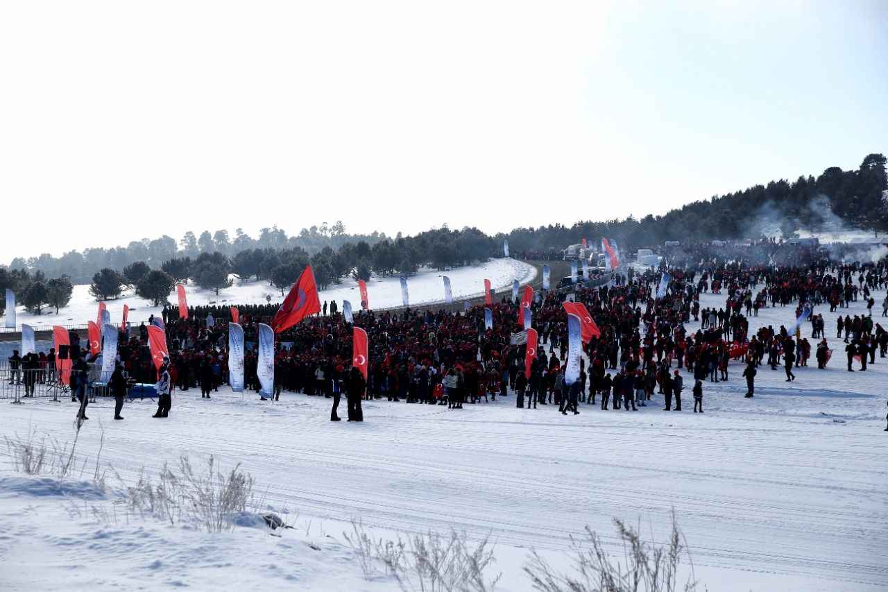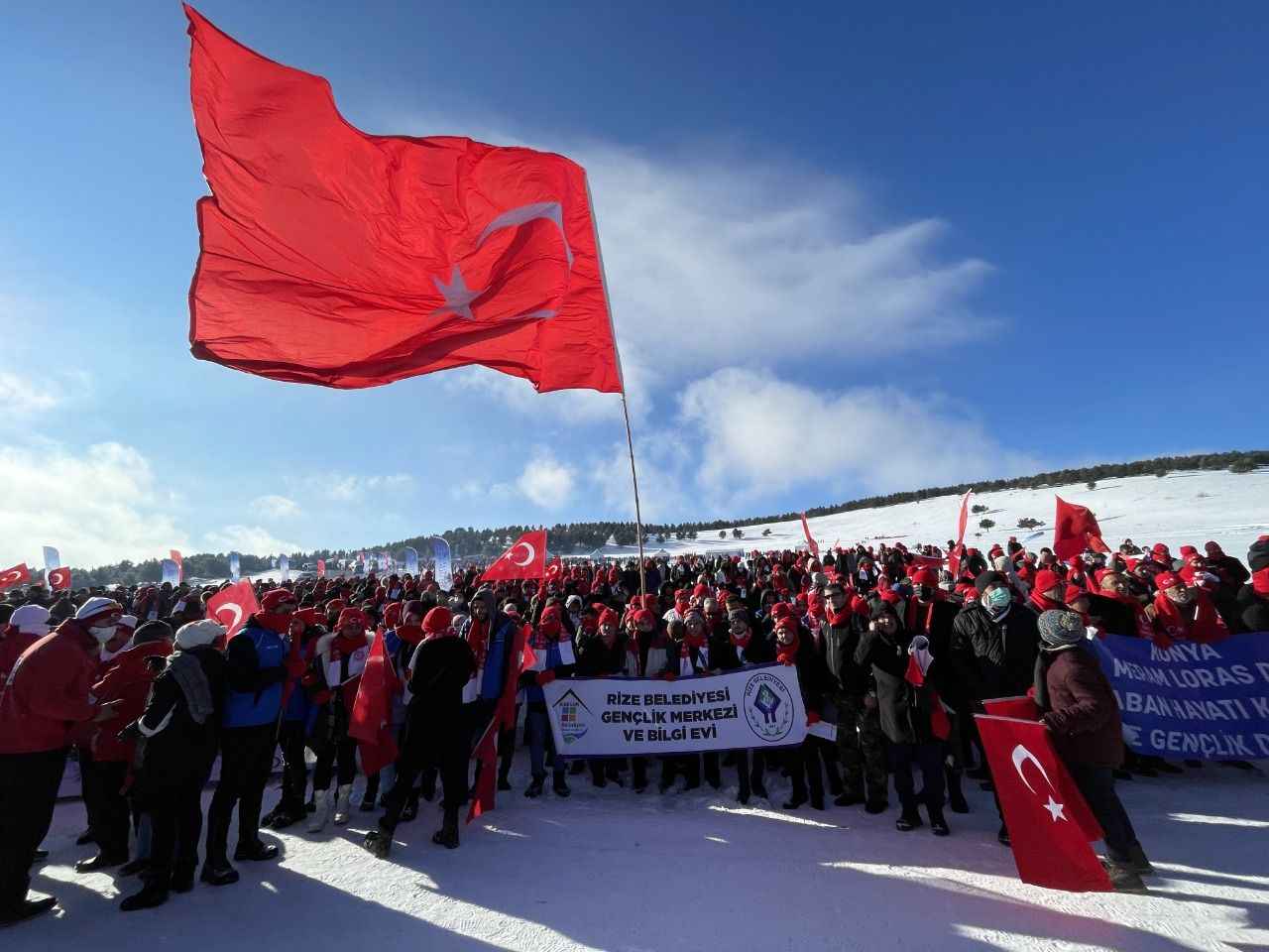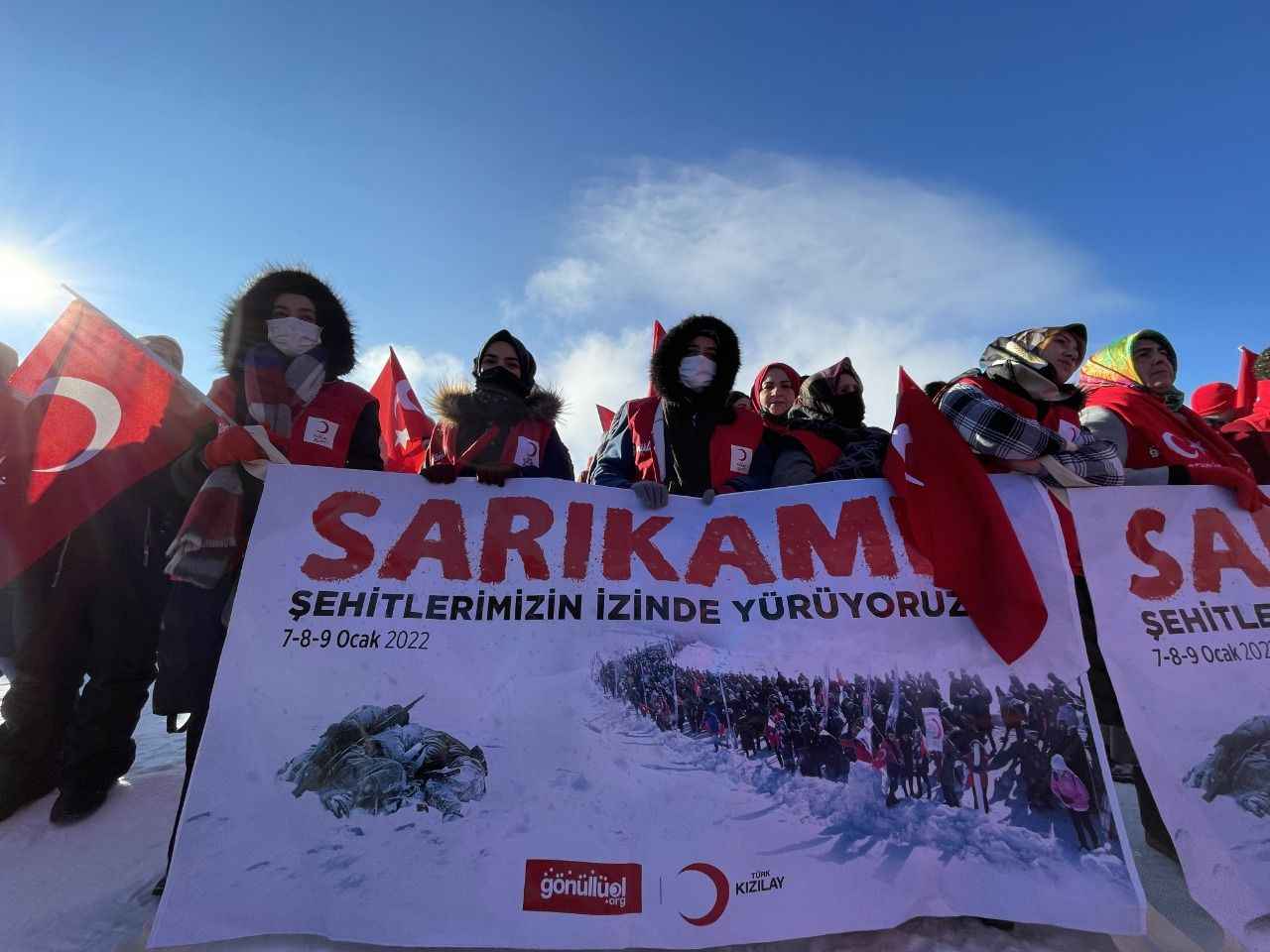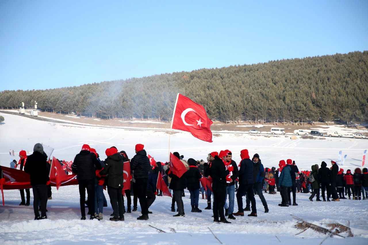 Kars merkez ve Sarıkamış ilçesinden, otobüslerle zirveye ulaşan vatandaşlar, ellerinde Türk bayraklarıyla yürüyerek toplanma alanında buluştu.