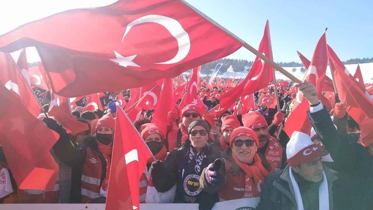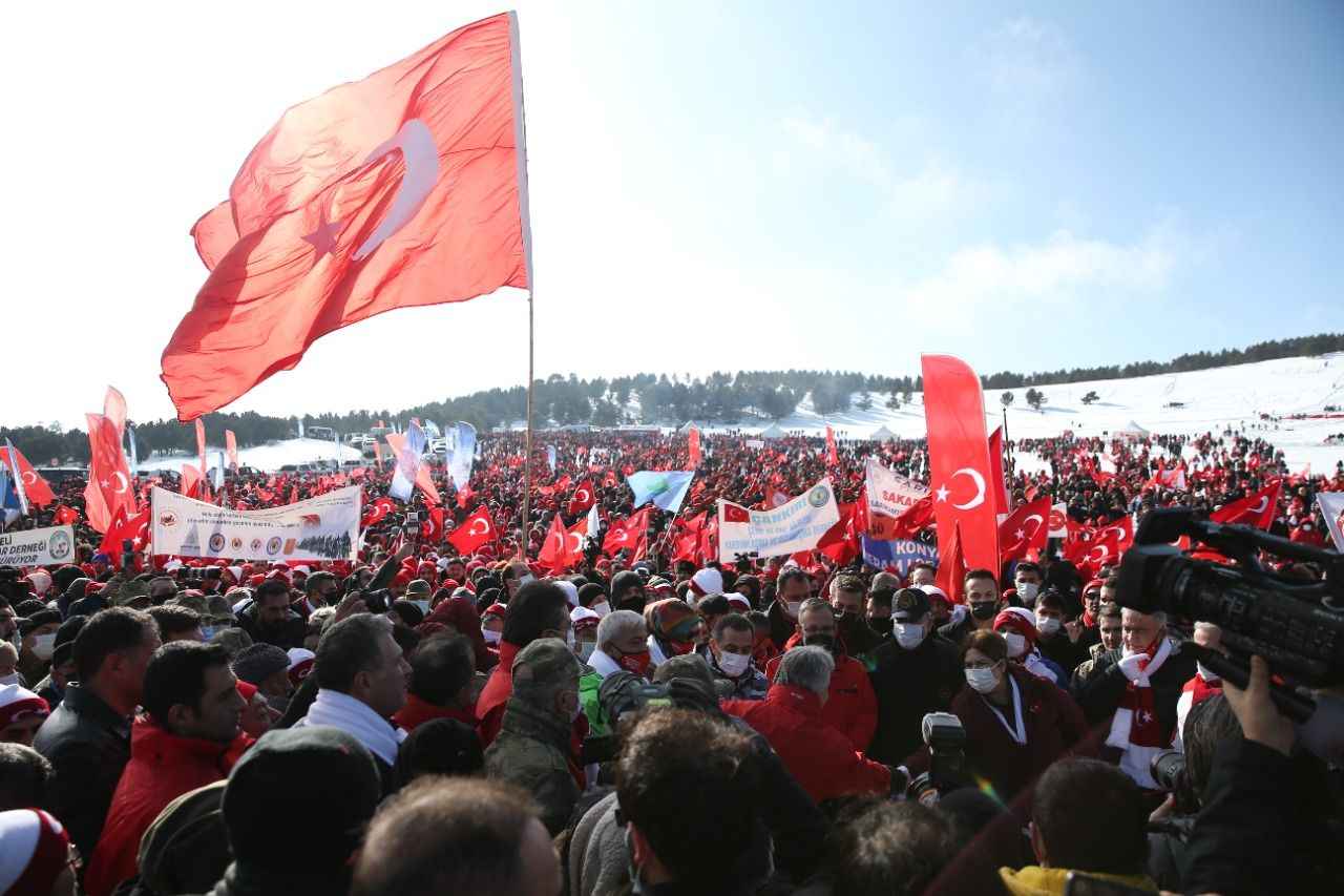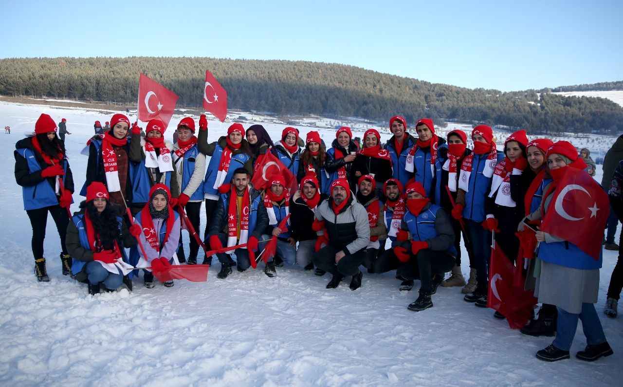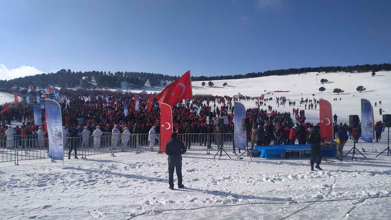 Kars merkez ve Sarıkamış ilçesinden, otobüslerle zirveye ulaşan vatandaşlar, ellerinde Türk bayraklarıyla yürüyerek toplanma alanında buluştu.