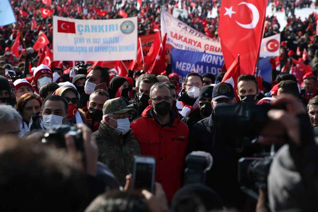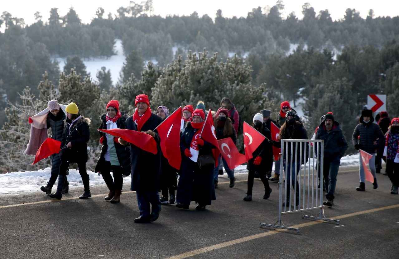 Ellerinde Türk bayrakları bulunan binlerce kişi, burada Kur'an-ı Kerim okuyup tekbir ve salavatlar getirerek şehitler için dua ettikten sonra soğuk havada Ay-Yıldızlı Tören Alanı'na doğru yürüyüşe geçti.