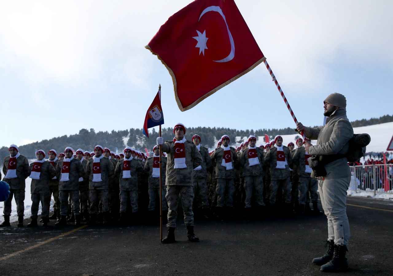 Mehmetçik, toplanma alanı çevresindeki dağlarda dev Türk bayrakları açtı, fedakar ecdadı anmak için bir araya gelen vefakar gençler de güvenlik güçleriyle hatıra fotoğrafı çektirdi.