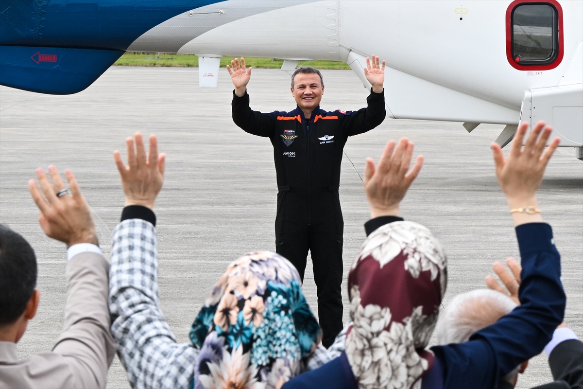 Alana helikopterle gelen Ax-3 mürettebatı, önce aileleriyle uzaktan selamlaştı, Gezeravcı da iki eliyle ailesine selam verdi.