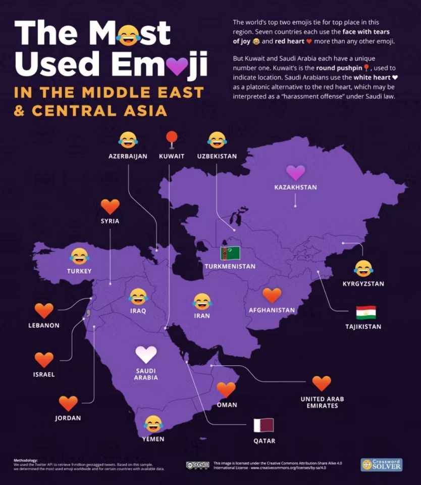 9 milyondan fazla coğrafi etiketli tweet analiz edilerek ülkelere göre en popüler emojiler belirlendi. Türkiye dahil olmak üzere 75 ülkede en çok kullanılan emoji ise aynı kaldı.