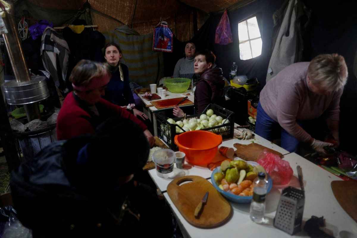 Mutfakta halk ve Ukrayna Bölgesel Savunma Kuvvetleri personeli için yemek hazırlanıyor. Bir taraftan sebzeler hazırlanırken, diğer ekip bunları pişirmek üzere işe koyuluyor.