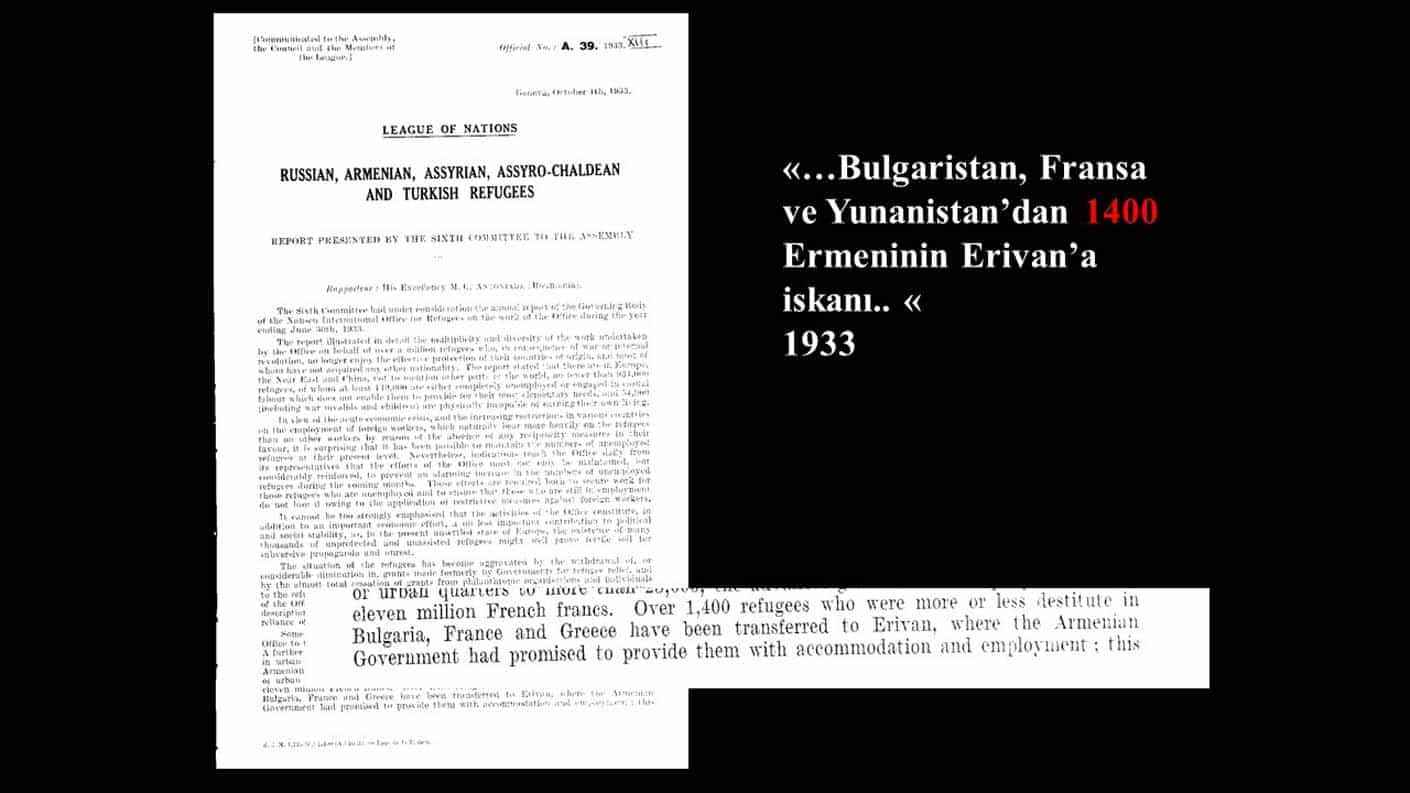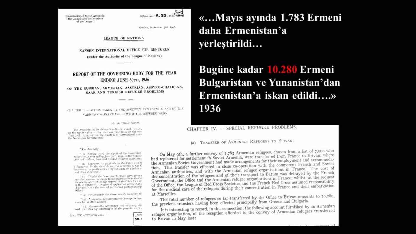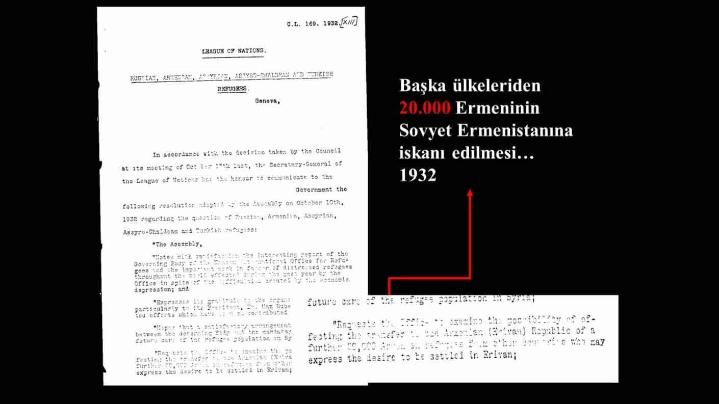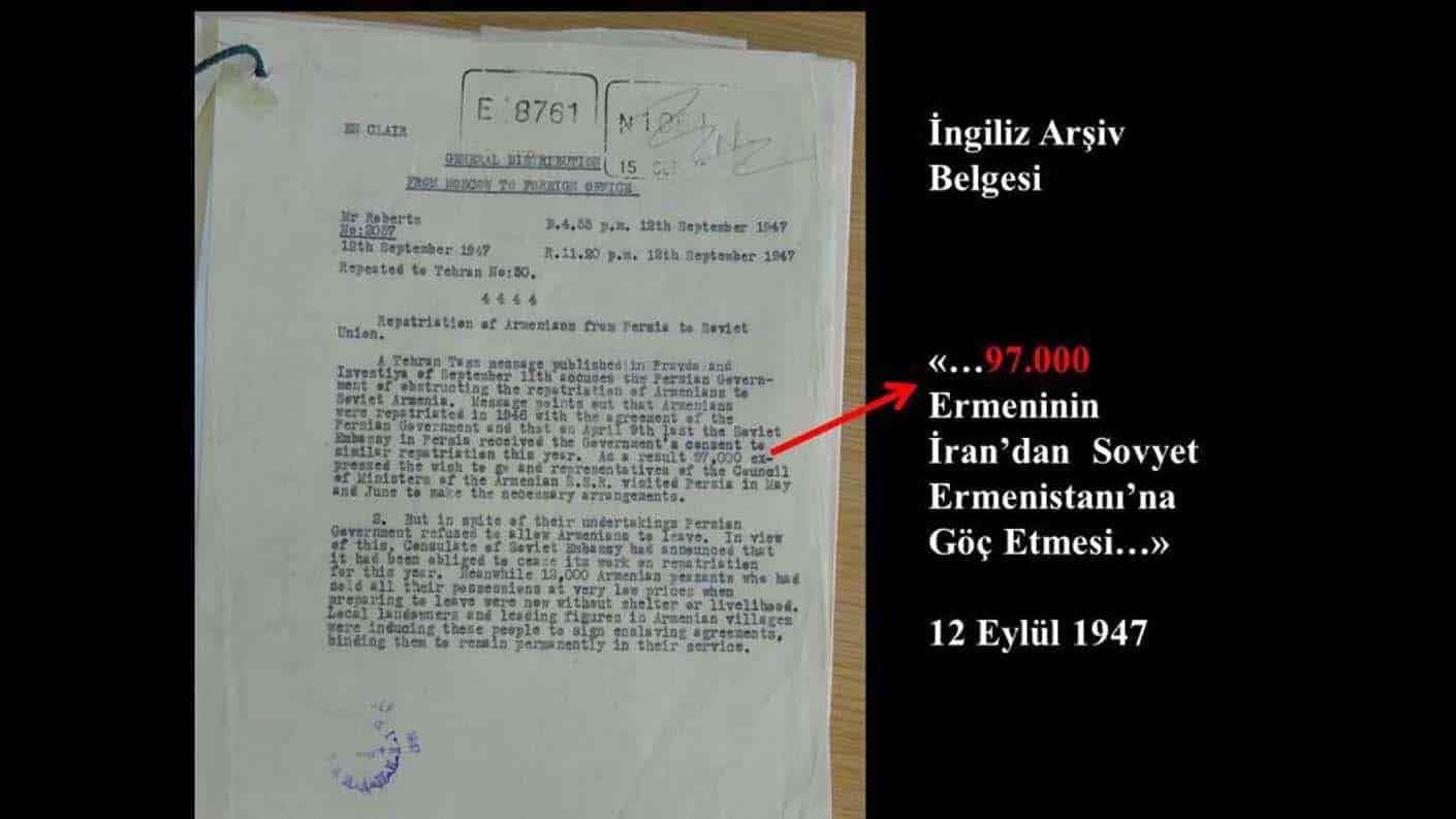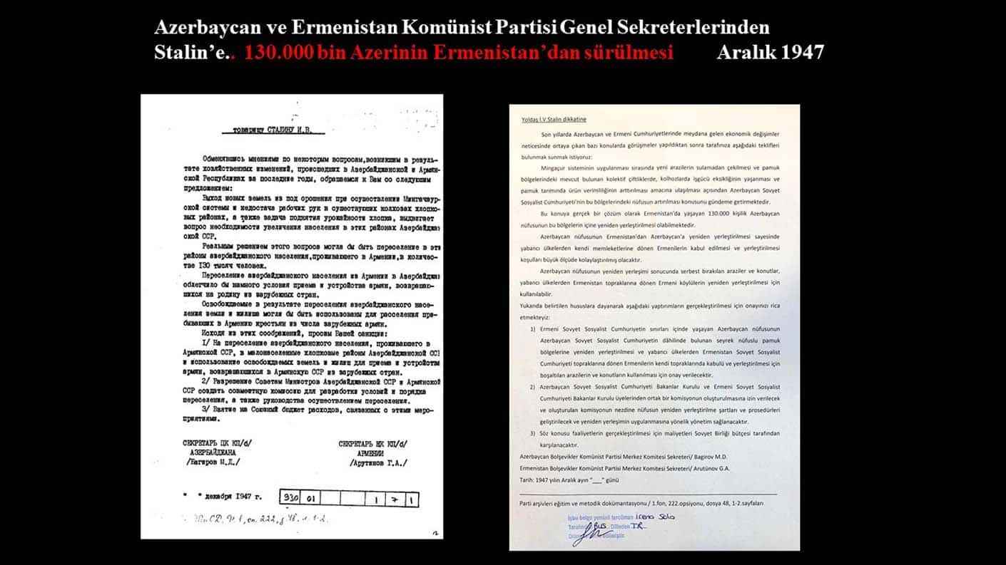 "Belgeye göre, o zaman Ermenistan oblastının Ermeni valisi, Komünist Parti'ye yani Stalin'e başvuruyor. 'Erivan ve çevresindeki Türk nüfusu Azerbaycan'a gönderelim. Oradaki pamuk tarlalarında çalıştıralım. Onlardan boşalacak yerlere de Ermenileri getirelim.' diyor. Stalin bunu kabul edecek ki bir yıl sonra SSCB Meclisi bir kanun çıkarıyor ve 200 bine yakın Azerbaycan Türk'ü Erivan ve çevresinden sökülüp alınacak Azerbaycan'a götürülüp, oraya iskan edilecektir. İşte bugün Ermenilerin işgallere gerekçe gösterdiği bu yapay nüfus bu şekilde oluşturuldu. Bir yandan dünyanın her yerinden Ermeniler taşındı, diğer yandan oradaki Türk nüfus başka yerlere sürgün edildi. 1914'ten günümüze Orta Doğu, İran, Avrupa ve dünyanın çeşitli yerlerinden 1 milyon Ermeni nüfus Erivan'a taşındı. Şüphesiz bunların yüz binlercesi daha sonra Ermenistan hükümetleri tarafından Karabağ'a iskan edildi."