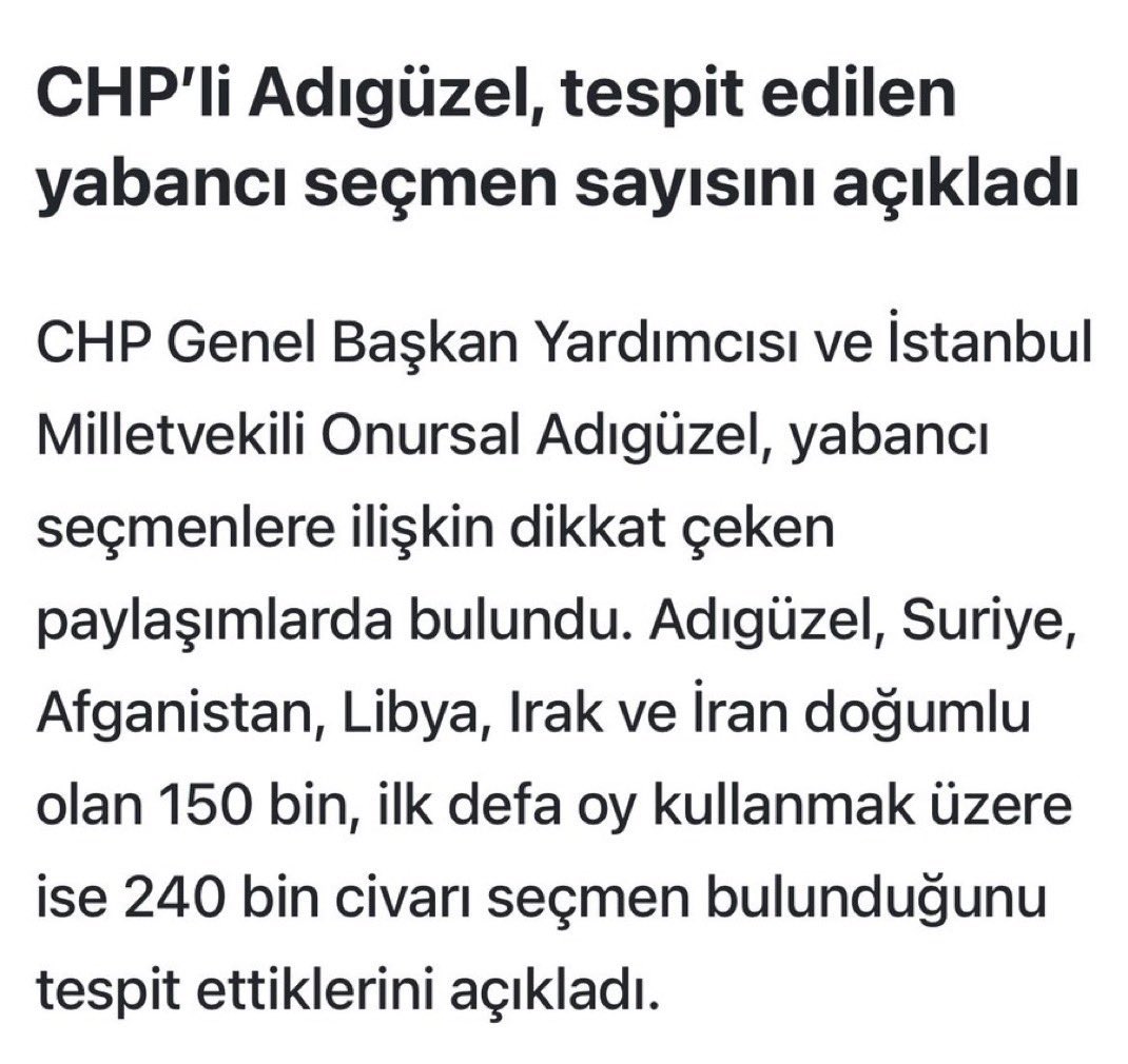 Ümit Özdağı’ın bu yalanı seçim döneminde ortağı olan CHP Genel Başkanı tarafından yalanlanmıştı.2023 seçiminde Suriye, Afganistan, Libya, Irak ve İran doğumlu 150 bin Türk vatandaşı seçme hakkına sahipti✅