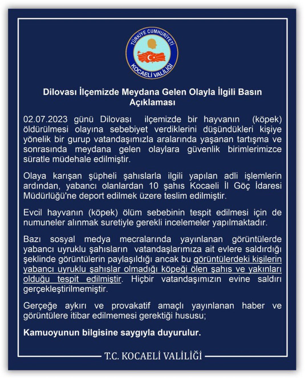 Kocaeli Valiliği olaya karışanların Türk vatandaşı olduğunu ve hiç bir vatandaşın evine saldırı olmadığını açıkladı ✅