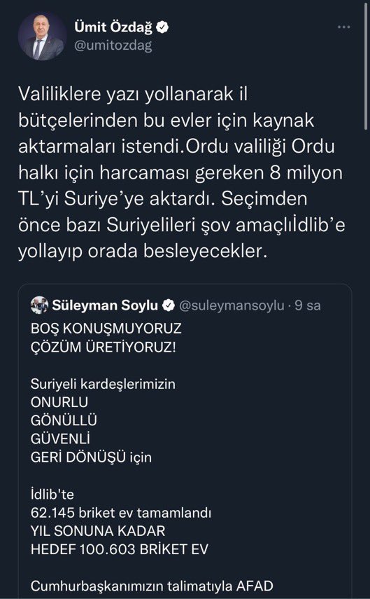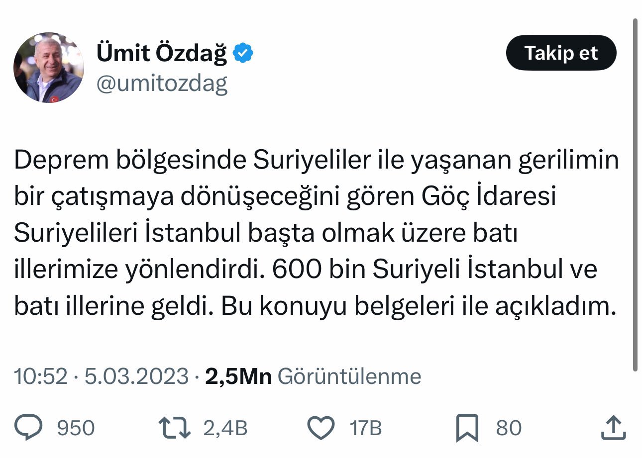 25) Ümit Özdağ'ın, "Kaymakam, sığınmacıların köy nüfusuna kaydını istemiş" tweeti ❌