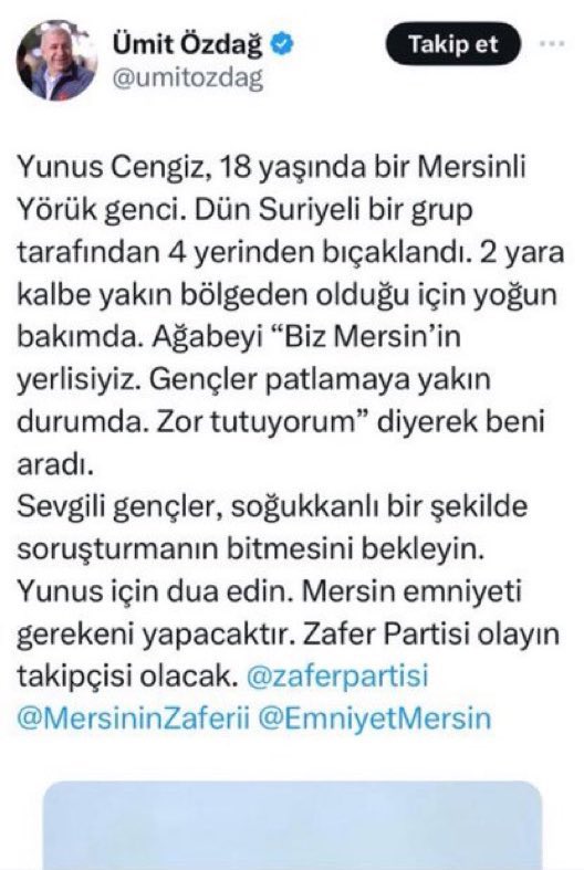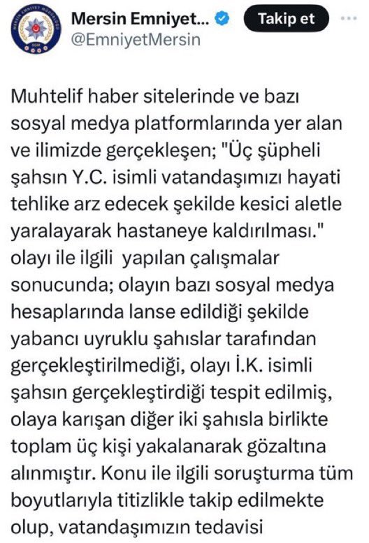 Yunus Cengiz’i bıçaklayanlar Suriyeli değil, İ.K isimli Türk vatandaşı olduğu ortaya çıktı. Mersin Emniyet Müdürlüğü iddiaları yalanladı.✅