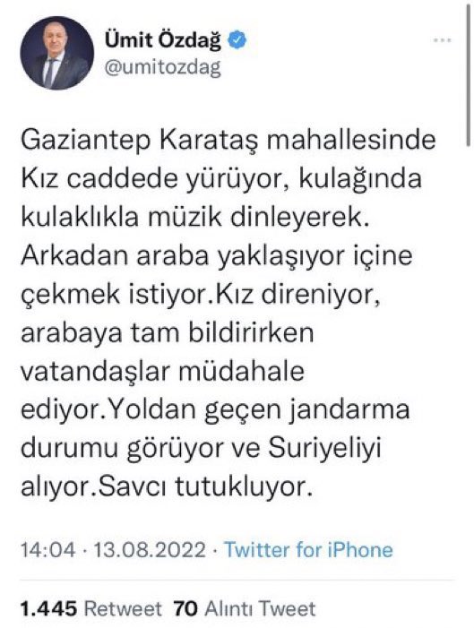 24) Ümit Özdağ’ın, bir Suriyeli’nin kızı aracın içine çekmeye çalıştığı iddiası.❌