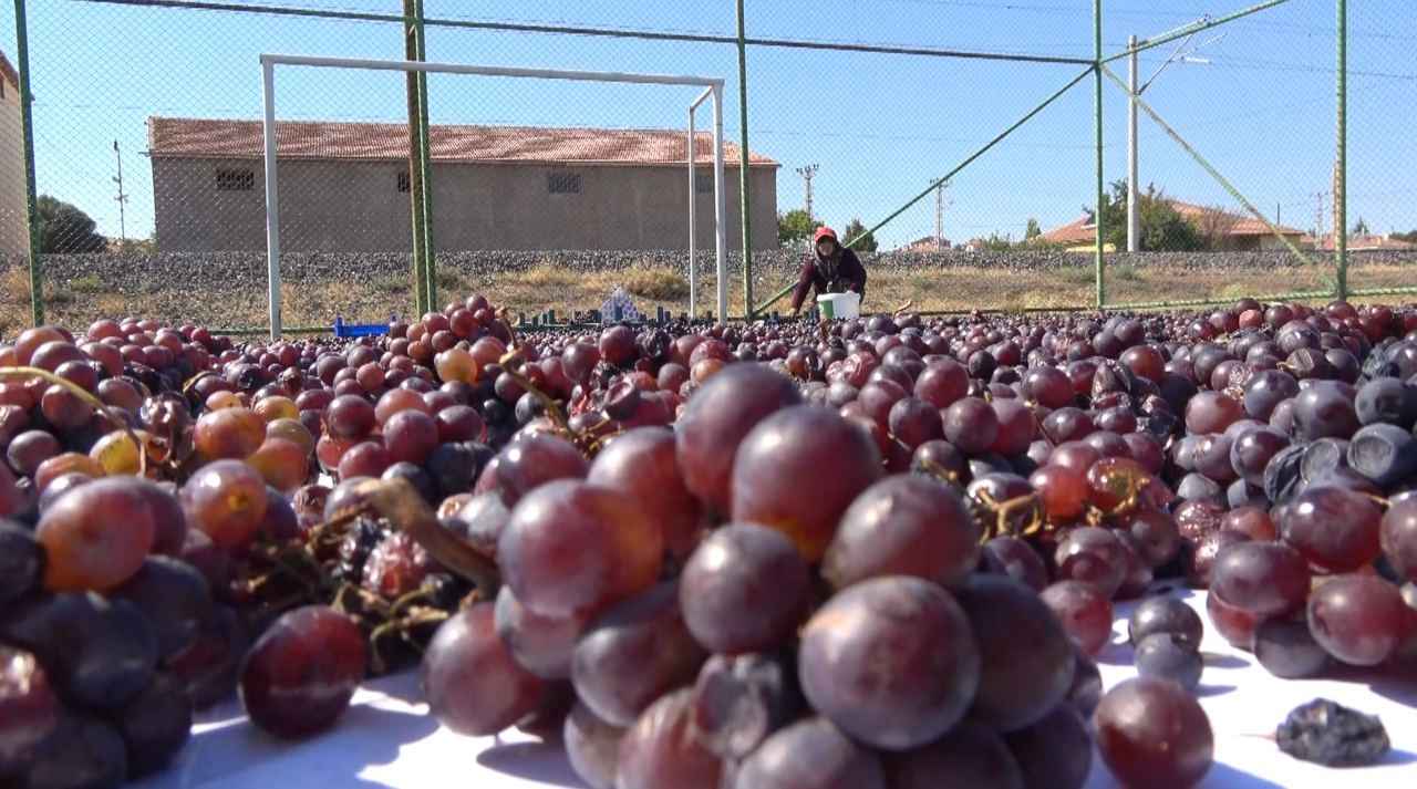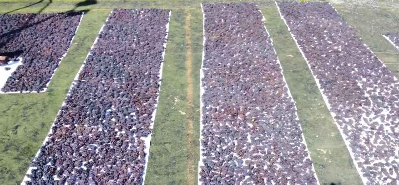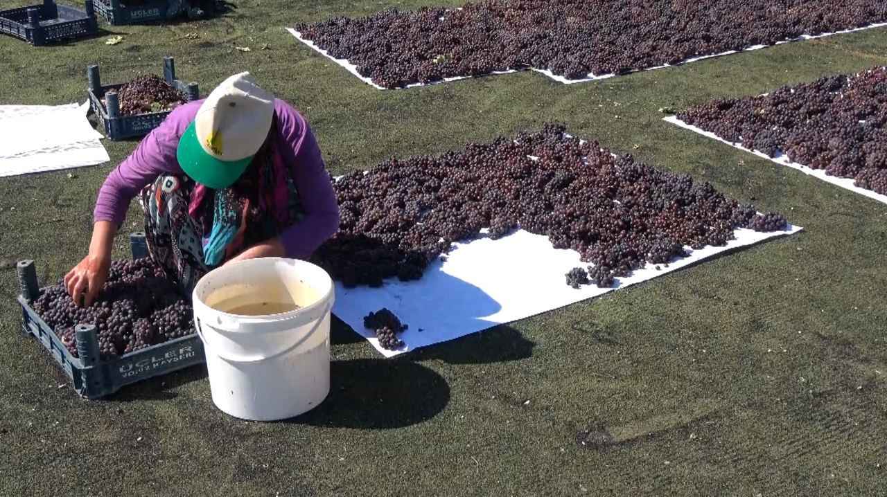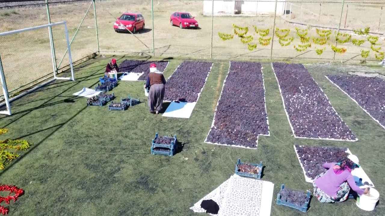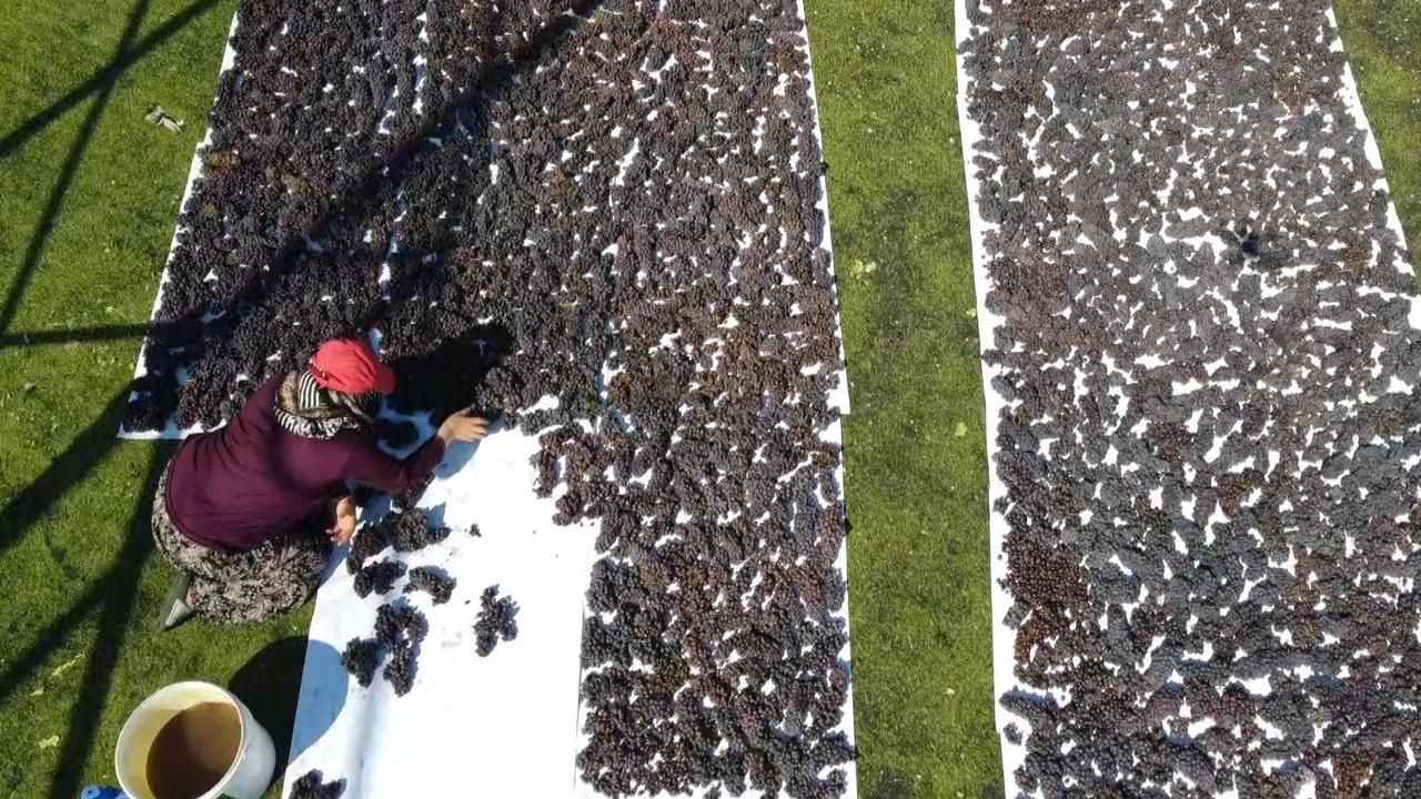 Asmalardan toplanan siyah üzümler kurutulmak üzere bir halı sahaya serildi.