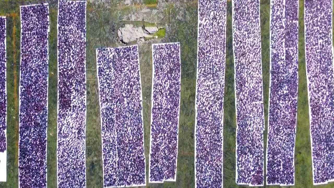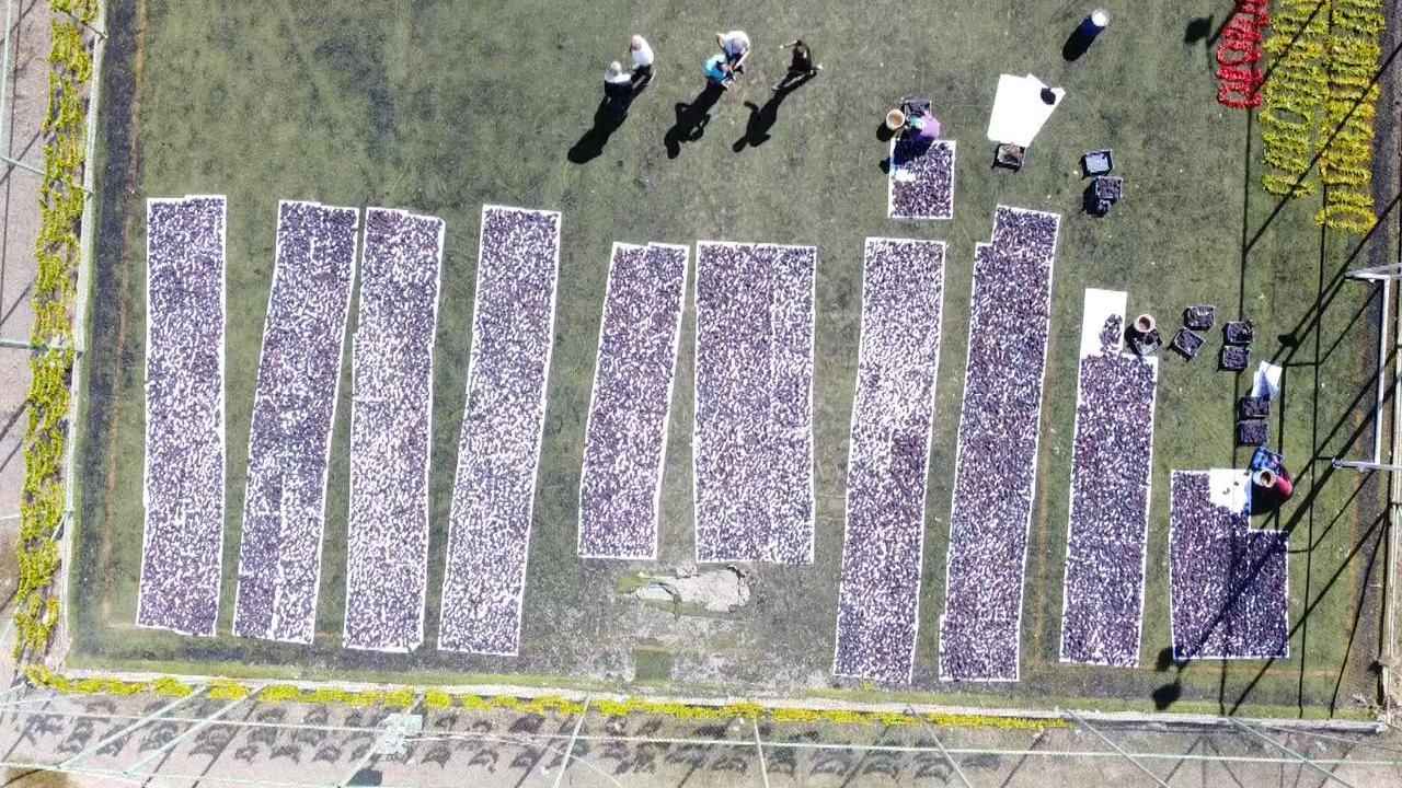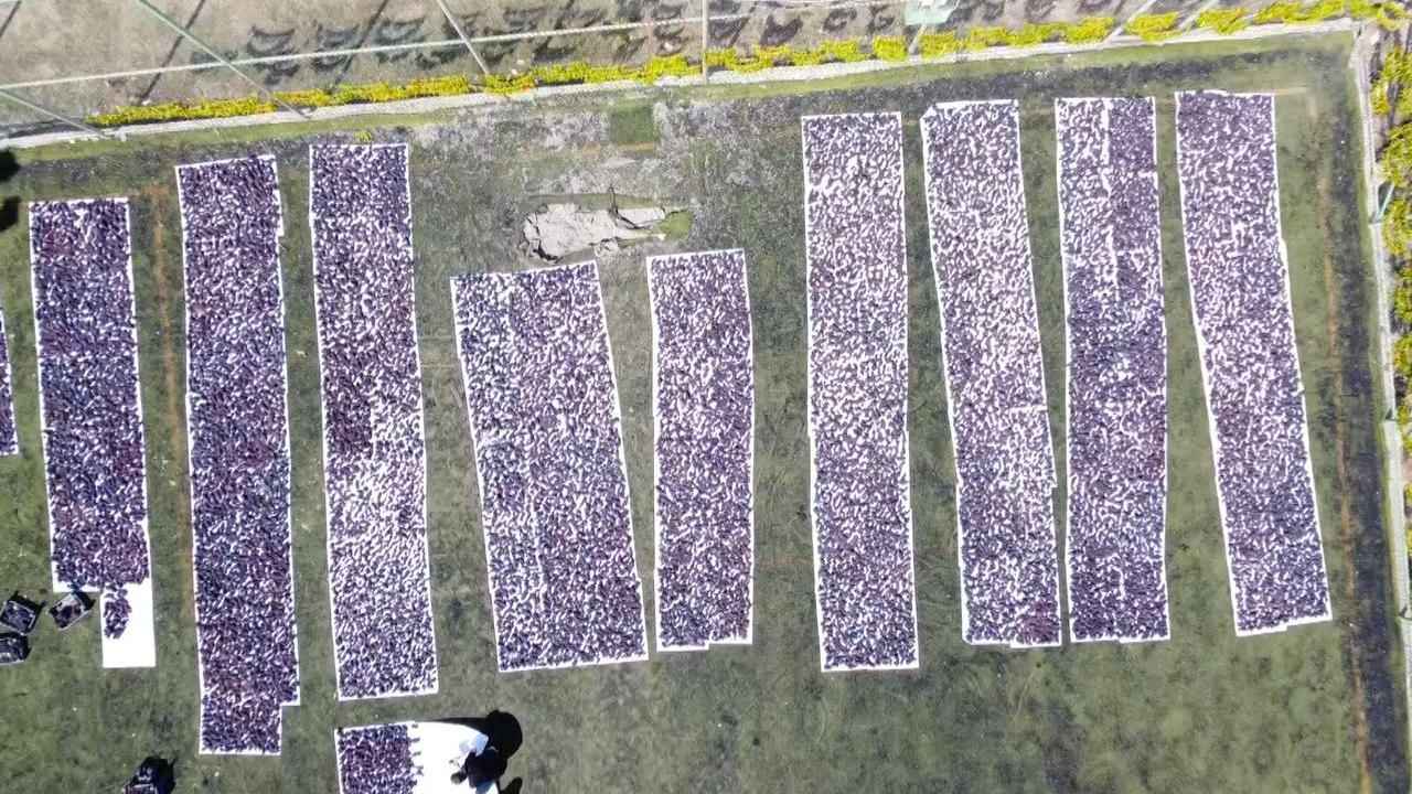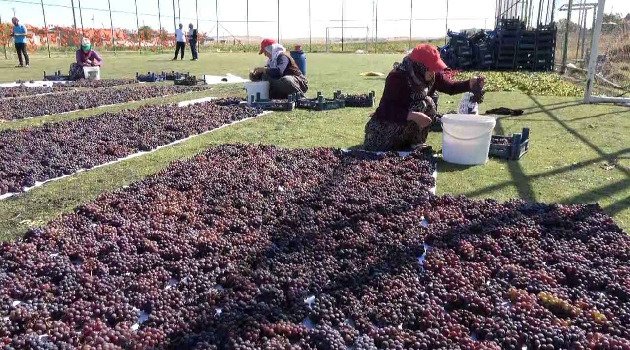 Asmalardan toplanan siyah üzümler kurutulmak üzere bir halı sahaya serildi.
