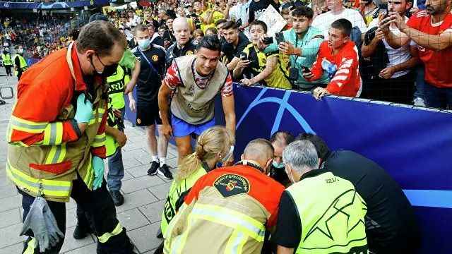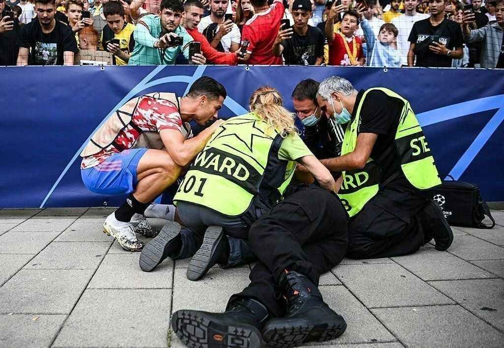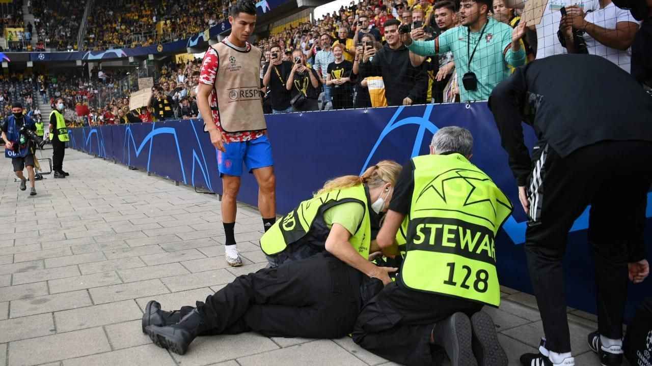 Çarpmanın etkisiyle bayılan kadın, çevrede kısa süreli endişeye neden olurken Ronaldo da ısınmayı bırakıp hemen yanına gitti.