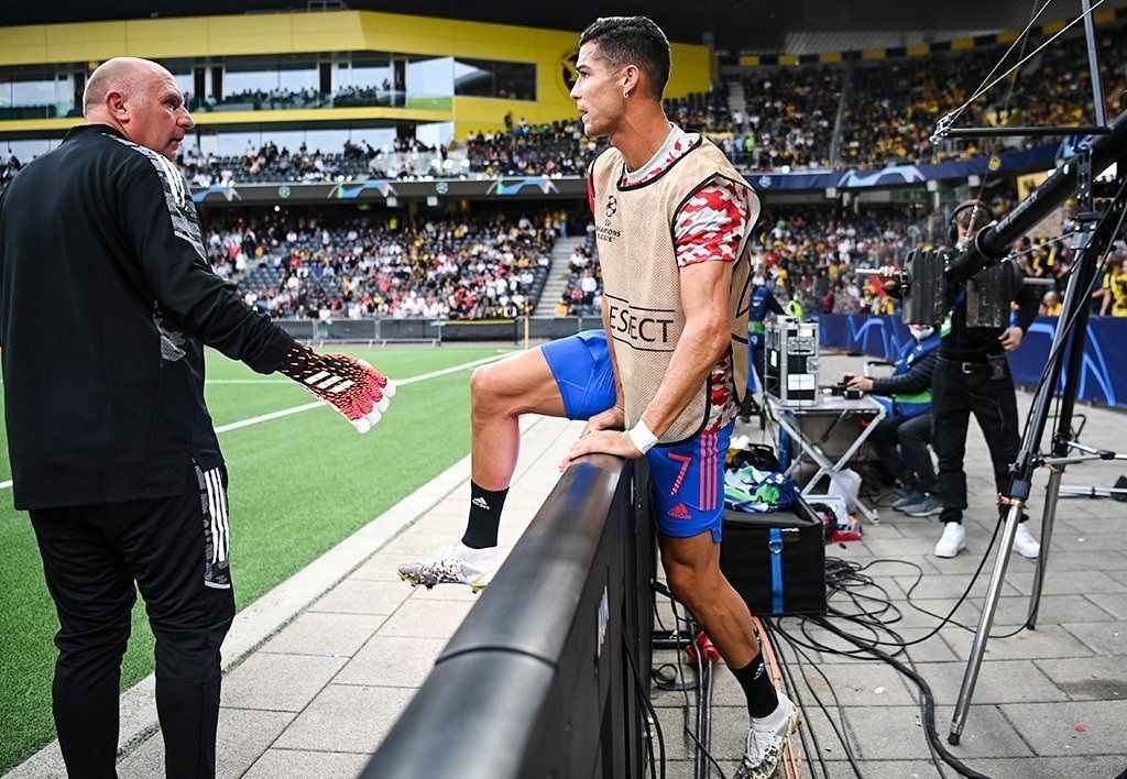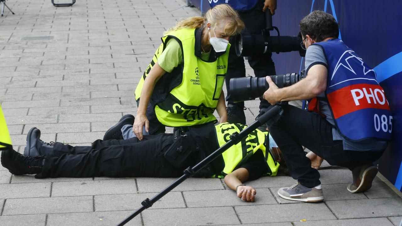 Karşılaşma öncesinde Cristiano Ronaldo'nun ısınmak için çektiği şutta top, kadın güvenlik görevlisine çarptı ve talihsiz anlar yaşandı.