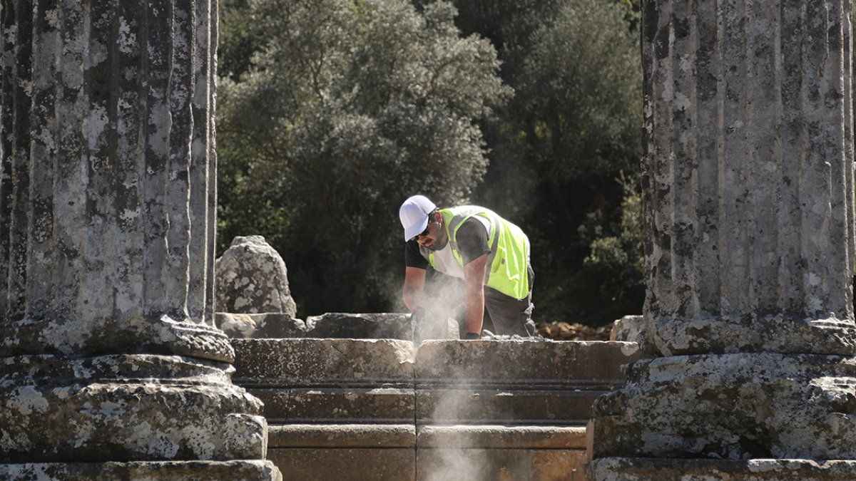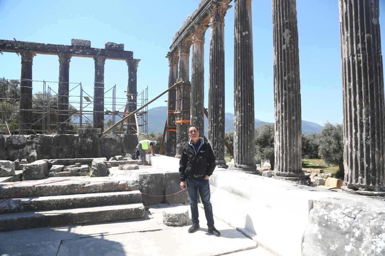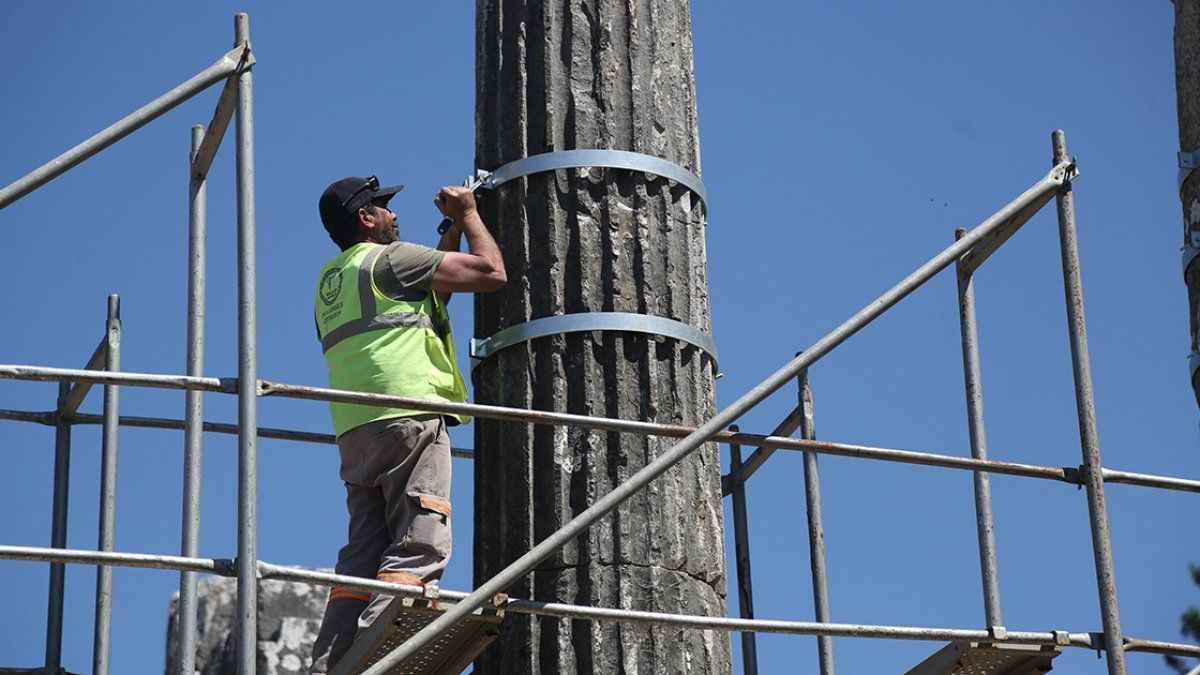 "Yine demir, bronz ve kurşun kullanmak suretiyle bu birleştirmeleri gerçekleştirdik. Restorasyonda kullandığımız mimari yapıların da büyük bölümü orijinal malzemelerden oluşuyor. Bu çerçevede öncelikli olarak 6 sütunun alt tamburlarını orijinal yerlerine koyduk.