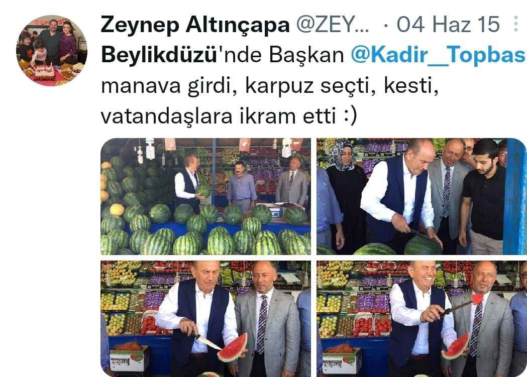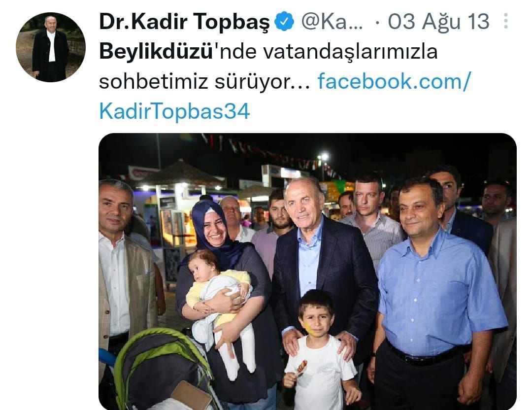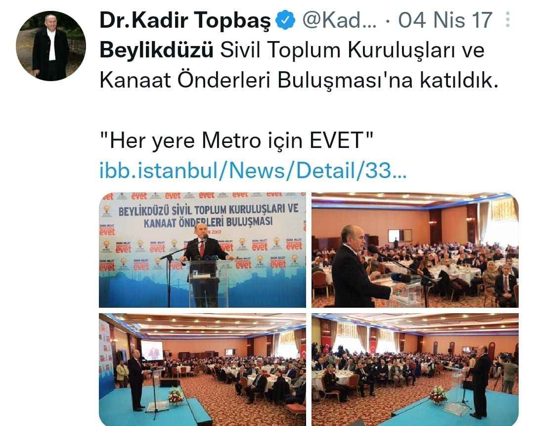 Ancak Ekrem İmamoğlu'nun Beylikdüzü Belediye Başkanlığı yaptığı dönemde İstanbul Büyükşehir Belediye Başkanı olan merhum Kadir Topbaş'ın Beylikdüzü'nde düzenlenen bir etkinliğe katıldığı ve İmamoğlu'nun kendisine bu ziyaret nedeniyle teşekkür ettiği anlar ortaya çıktı. İmamoğlu ziyaret esnasında yaptığı konuşmada "İstanbul Büyükşehir Belediye Başkanımız Sayın Kadir Topbaş'a öncelikle tabii ki o İstanbul'un belediye başkanı ama yine de ilçemize hoşgeldiniz diyoruz. Sefalar getirdiniz" demişti.