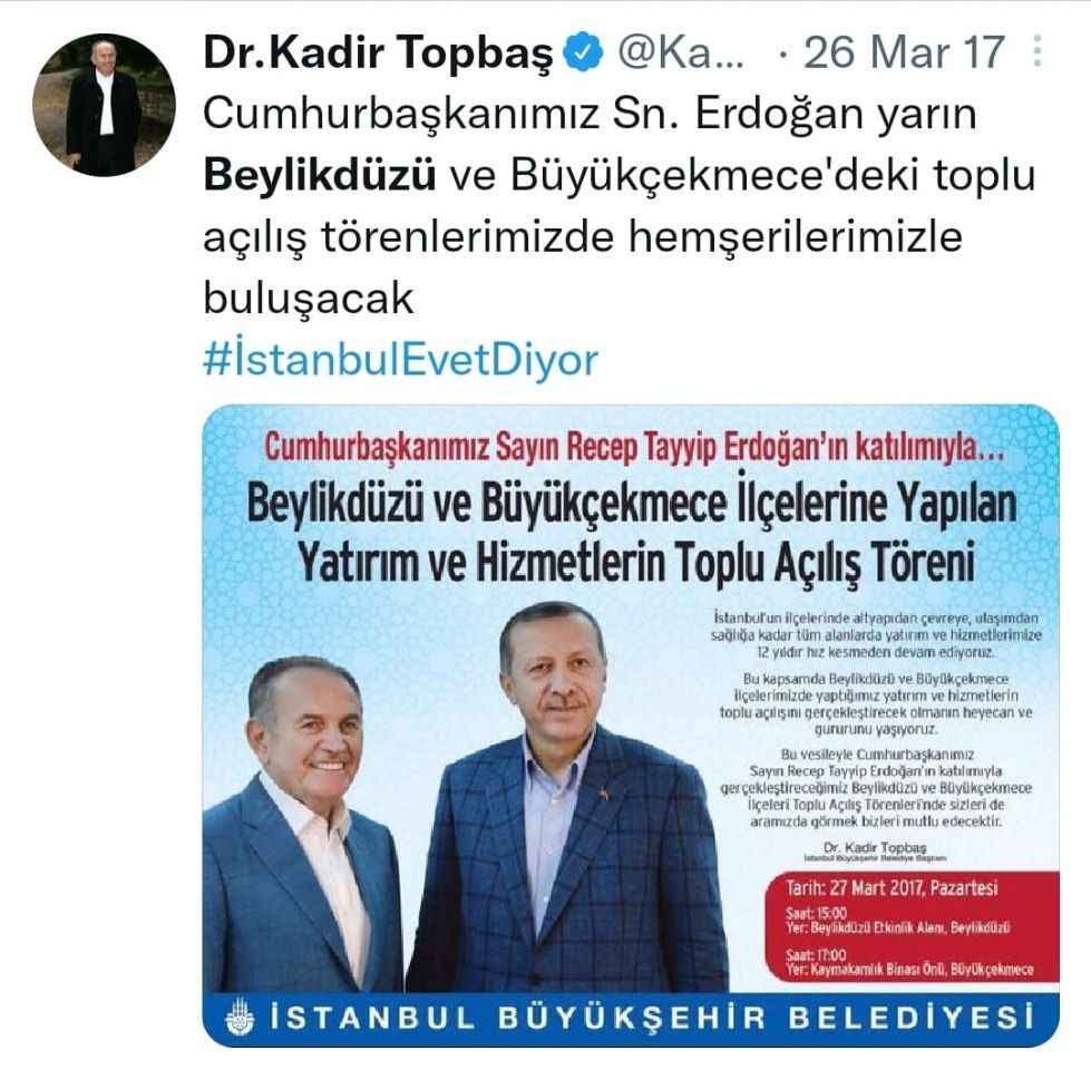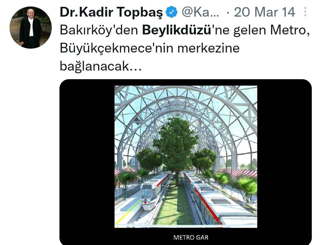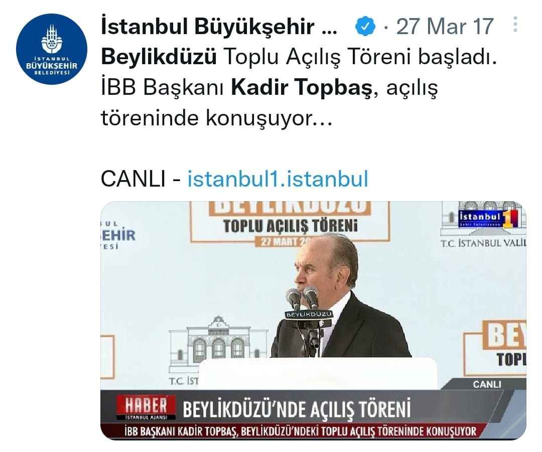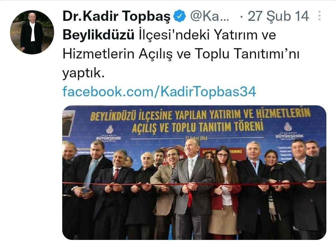 Diğer yandan 2014 yılında İBB Başkanı olan merhum Kadir Topbaş'ın sosyal medya hesabından yaptığı paylaşımda "Beylikdüzü İlçesi'ndeki Yatırım ve Hizmetlerin Açılış ve Toplu Tanıtımı'nı yaptık." ifadelerini kullandığı görüldü. Bu paylaşım İBB Başkanı İmamoğlu'nun sözlerinin gerçek dışı olduğunu da ortaya çıkardı.
