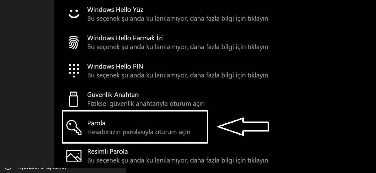 Açılan ekranda, bilgisayarınıza koyabileceğiniz çeşitli şifre yöntemleri karşınıza çıkacak. Parola seçeneğine tıklayın.