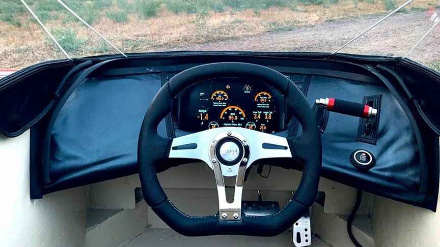 Araç, savaş uçağı gibi oturma düzenine sahip açık bir kokpite, gizli arka tekerleklere ve dijital bir gösterge panosuyla öne çıkıyor.