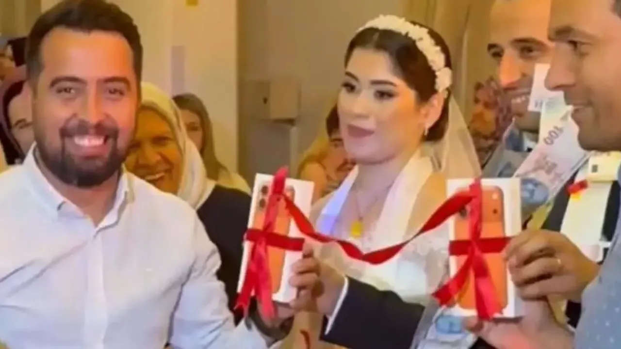 Damadın arkadaşları, geleneksel altın takma yerine Phone 17 Pro Max cep telefonu takarak herkesi şaşırttı. Gelin ve damat ise arkadaşlarının bu sürprizi karşısında hem şaşırdı hem de büyük mutluluk yaşadı.