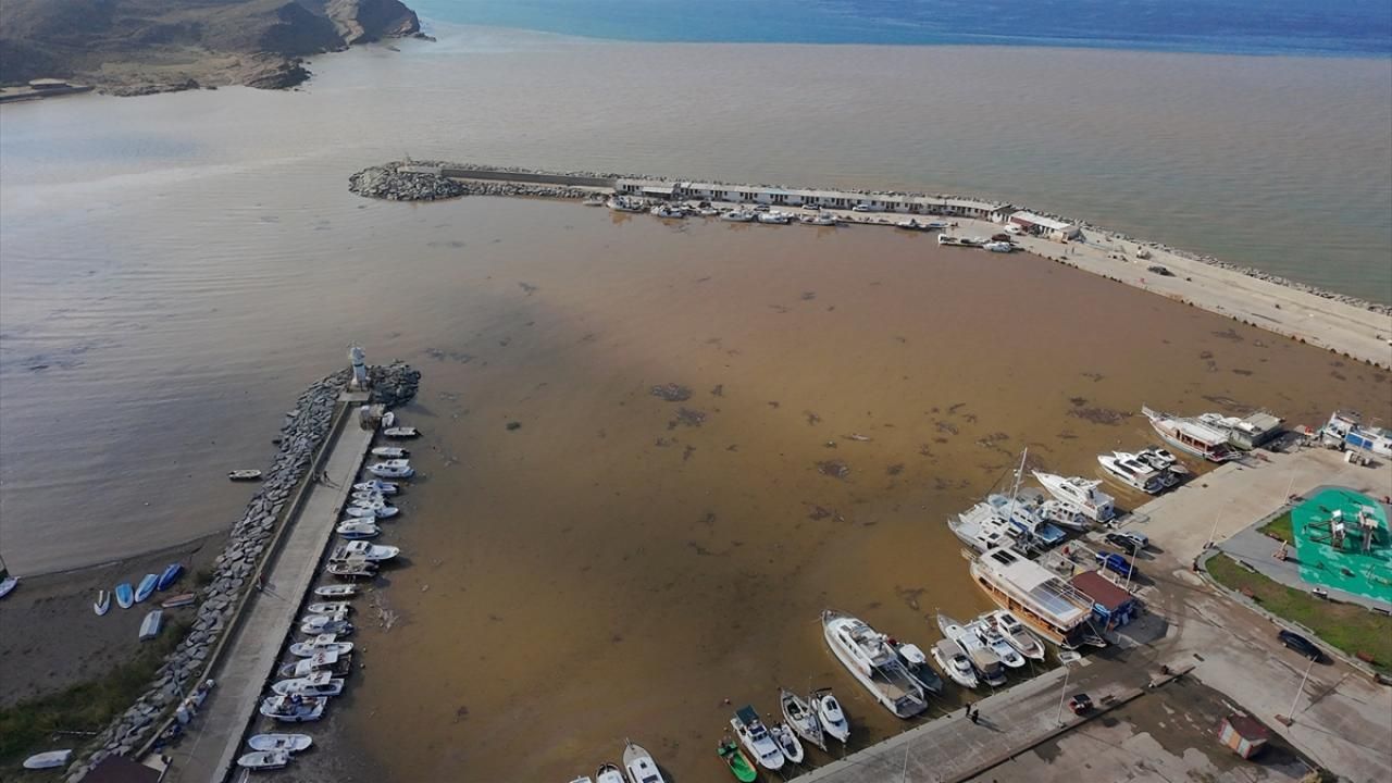 Çamurlu suyun aktığı Kaleköy Limanı kahverengi renge bürünürken dağlardan gelen malzemeler de teknelerin bağlı bulunduğu alana yayıldı.