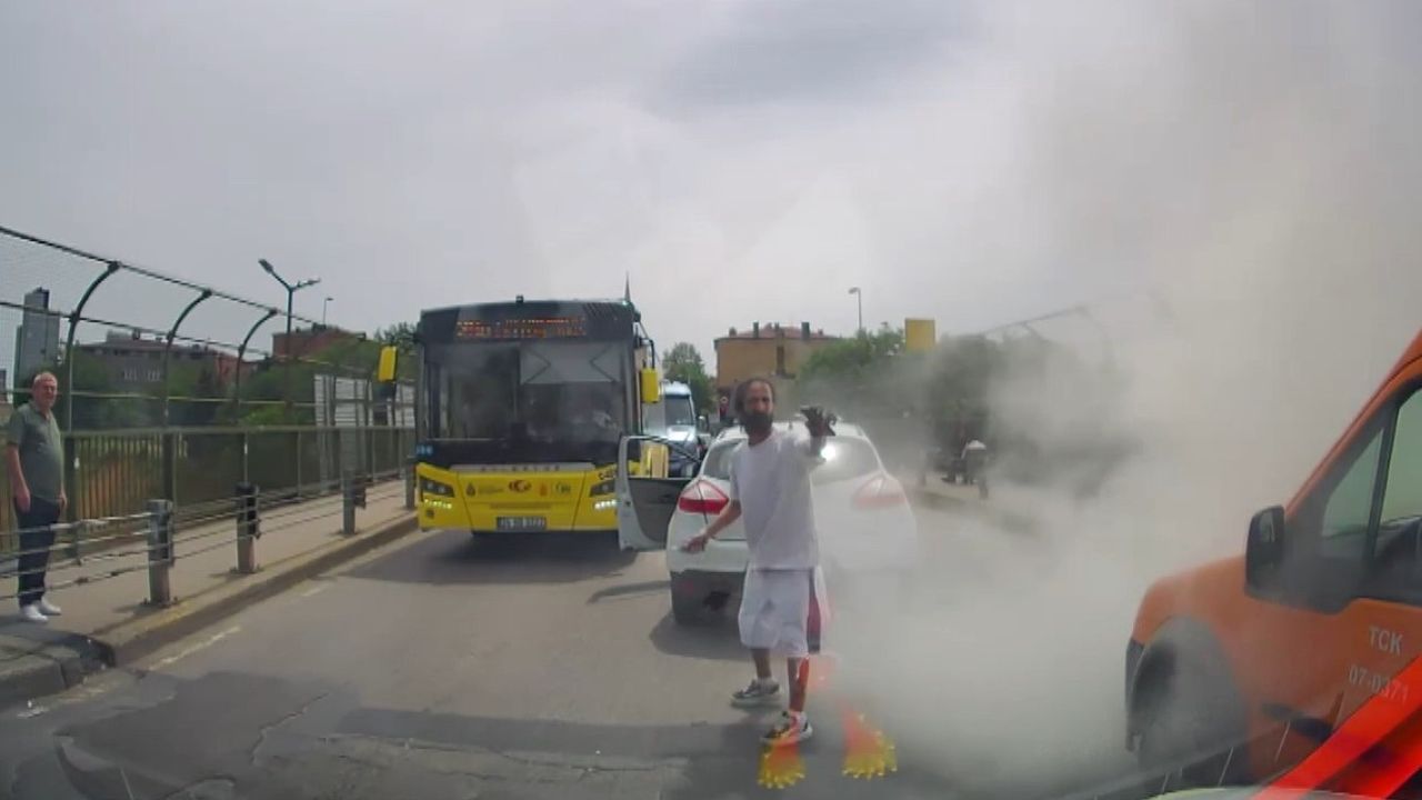 Bu sırada aracının bagajından yangın tüpünü alan hafif ticari aracın şoförü, bıçaklı saldırganı durdurmak için yangın tüpünün tetiğine bastı.