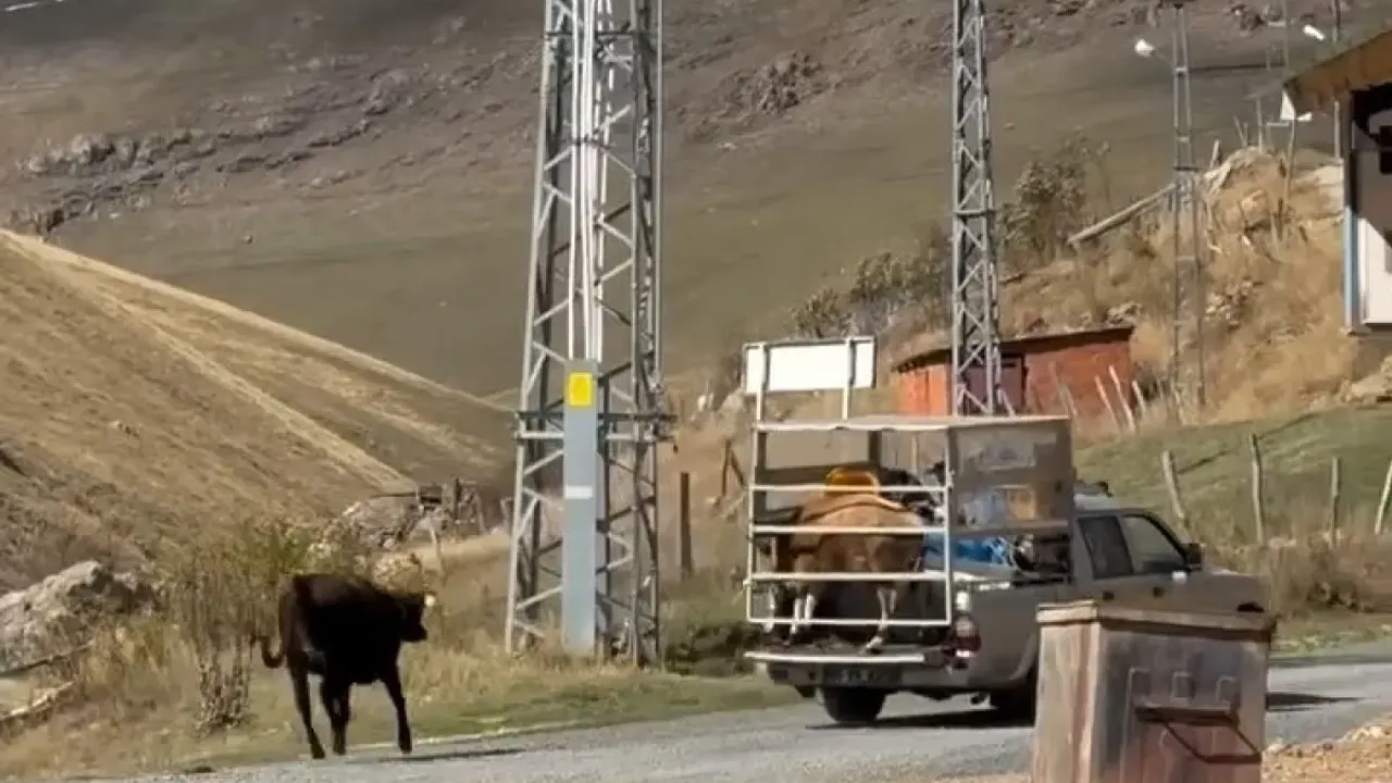Kamyonet hareket ederken, geride kalan diğer inek aracın ardından koşmaya başladı.