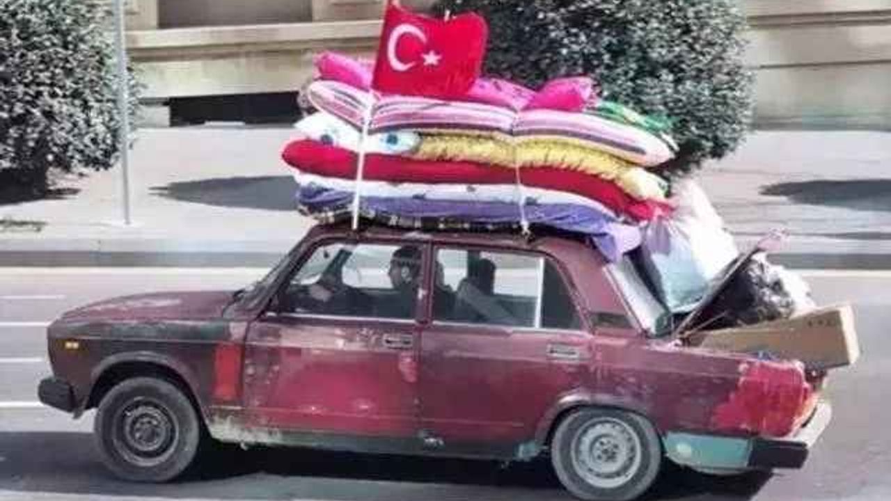Azerbaycan'ın başkenti Bakü'nün kuzeyindeki Ceylanbatan kasabasında yaşayan 33 yaşındaki Server Beşirli, Kahramanmaraş'ta meydana gelen depremlerden etkilenenlere destek için akrabalarından ve köy halkından topladığı yorganları Türk ve Azerbaycan bayrağının dalgalandığı eski aracının tavanına yükleyerek Bakü'ye gitti.