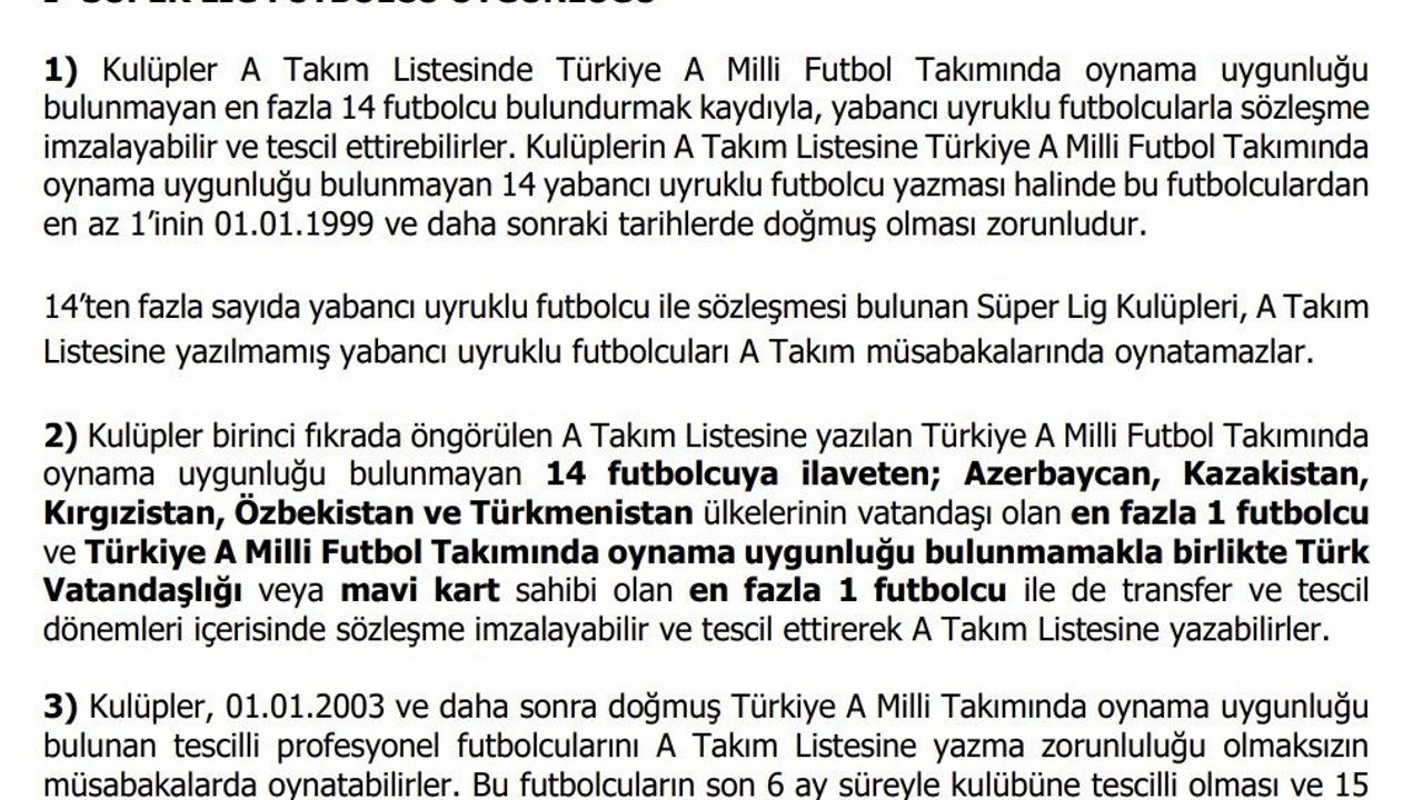" Türkiye A Milli Futbol Takımında oynama uygunluğu bulunmayan 14 futbolcuya ilaveten; Azerbaycan, Kazakistan, Kırgızistan, Özbekistan ve Türkmenistan ülkelerinin vatandaşı olan en fazla 1 futbolcu ve Türkiye A Milli Futbol Takımında oynama uygunluğu bulunmamakla birlikte Türk Vatandaşlığı veya mavi kart sahibi olan en fazla 1 futbolcu ile de transfer ve tescil dönemleri içerisinde sözleşme imzalayabilir ve tescil ettirerek A Takım Listesine yazabilirler."