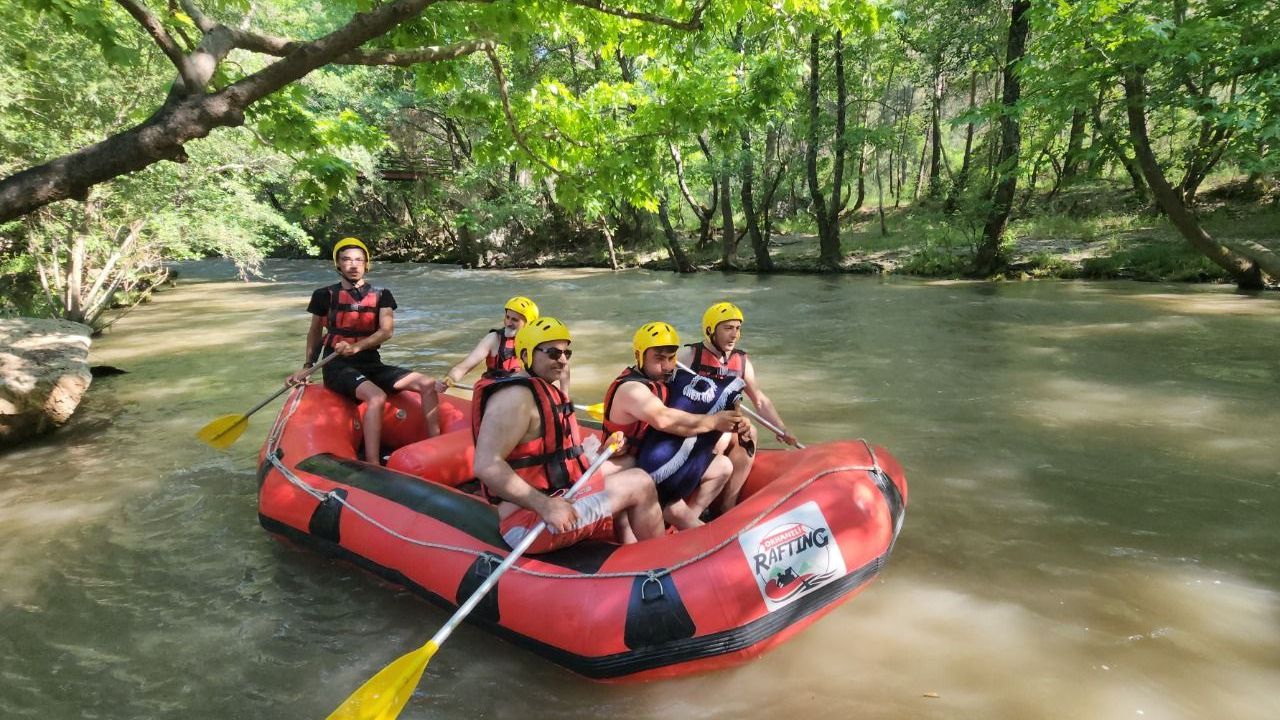 Tulum eşliğinde iki botla Kocasu'da rafting yapan ziyaretçiler, unutamayacakları bir zaman dilimi geçirdi.
