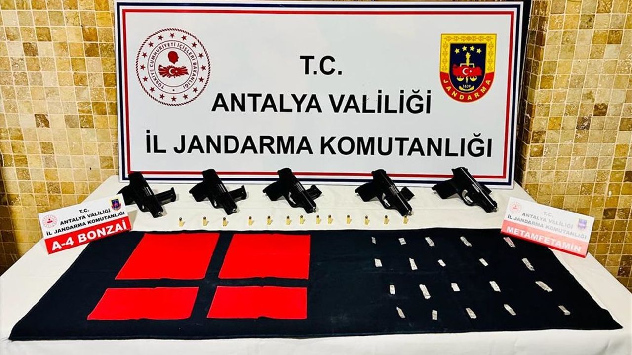 İstihbarat Şube Müdürlüğü ve Kepez İlçe Jandarma Komutanlığı ekiplerince şüphelilerin adreslerine düzenlenen operasyonda 5 ruhsatsız tabanca, 5 tabanca şarjörü, 13 fişek, farklı miktarlarda sentetik uyuşturucu ele geçirildi.