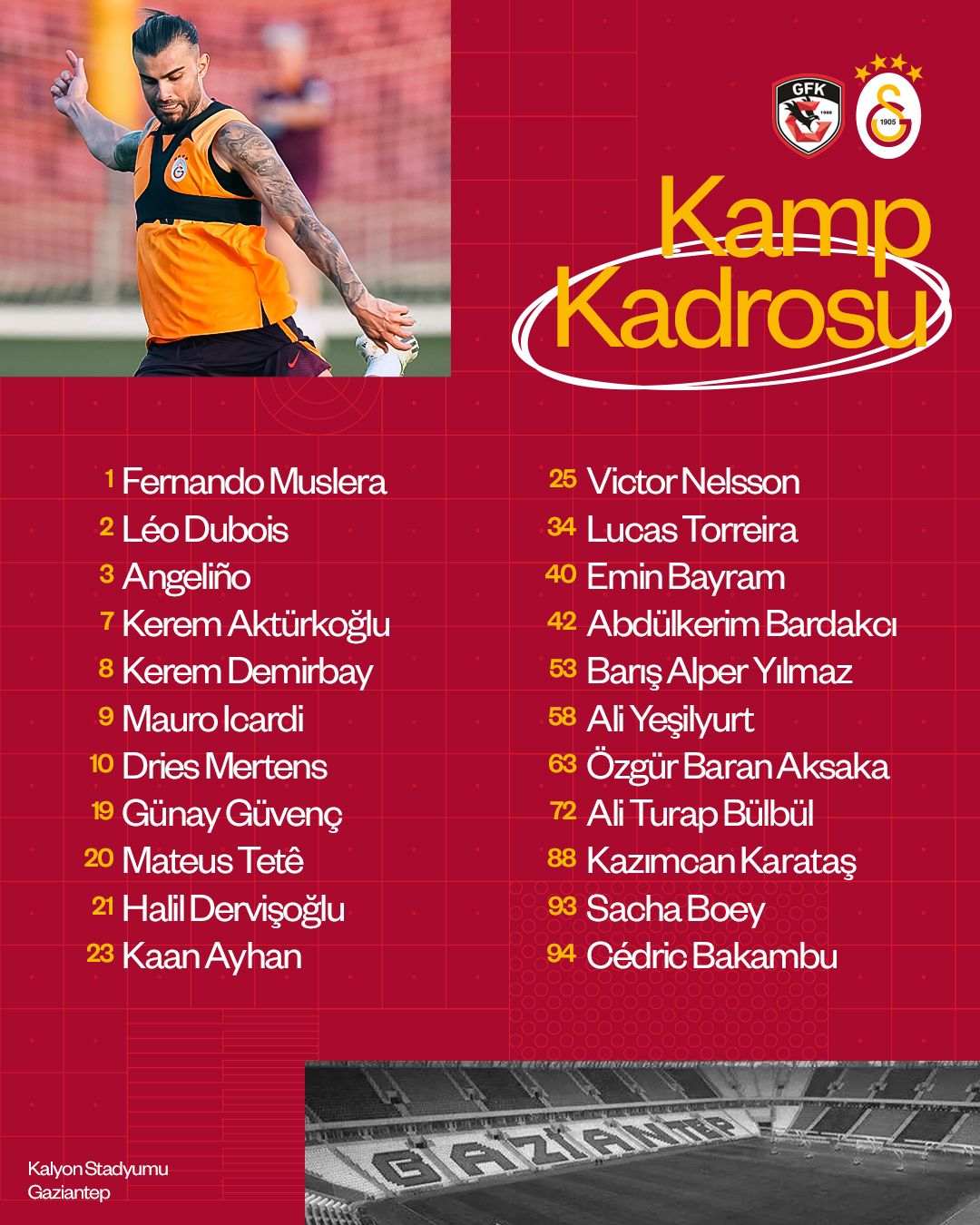 Galatasaray kulübü Gaziantep FK maçı kamp kadrosunu açıkladı. Transfer görüşmelerine devam eden Midtjsö, sakatlıkları bulunan Sergio Oliviera ve Wlifred Zaha, antenman eksikliği bulunan Hakim Ziyech kamp kadorsunda bulunmuyor.