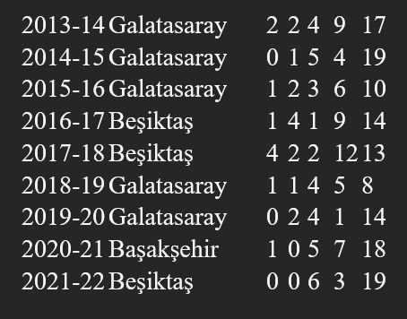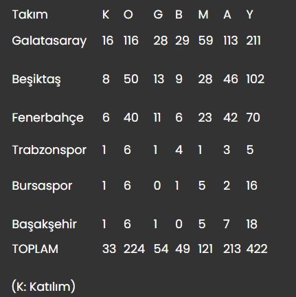 Galatasaray 116, Beşiktaş 50, Fenerbahçe 40, Trabzonspor, Bursaspor ve Başakşehir de 6'şar kez UEFA Şampiyonlar Ligi'nde sahaya çıktı.