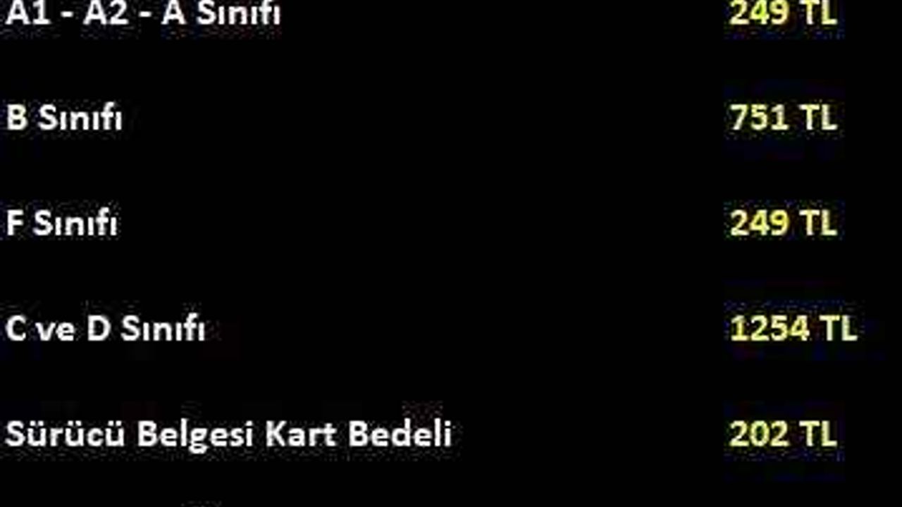 A1, A2, A sınıfı ehliyet ücreti 249 TL B sınıfı ehliyet ücreti 751 TL F sınıfı ehliyet ücreti 249 TL C, D sınıfı ehliyet ücreti 1254 TL Ehliyet kart bedeli 202 TL Polis vakıf ücreti 38 TL