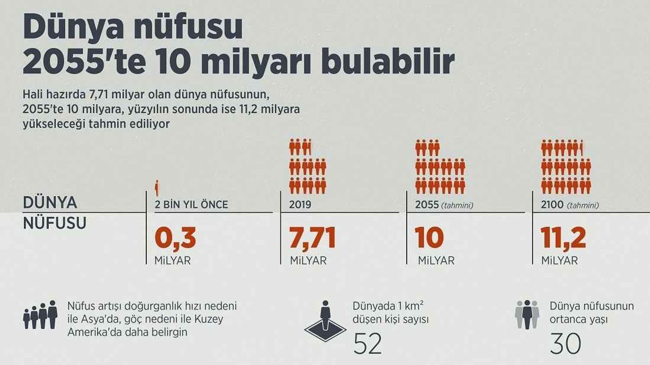 Halihazırda 7,71 milyar olan dünya nüfusunun, 2055’te 10 milyara, yüzyılın sonunda ise 11,2 milyara yükseleceği tahmin ediliyor.