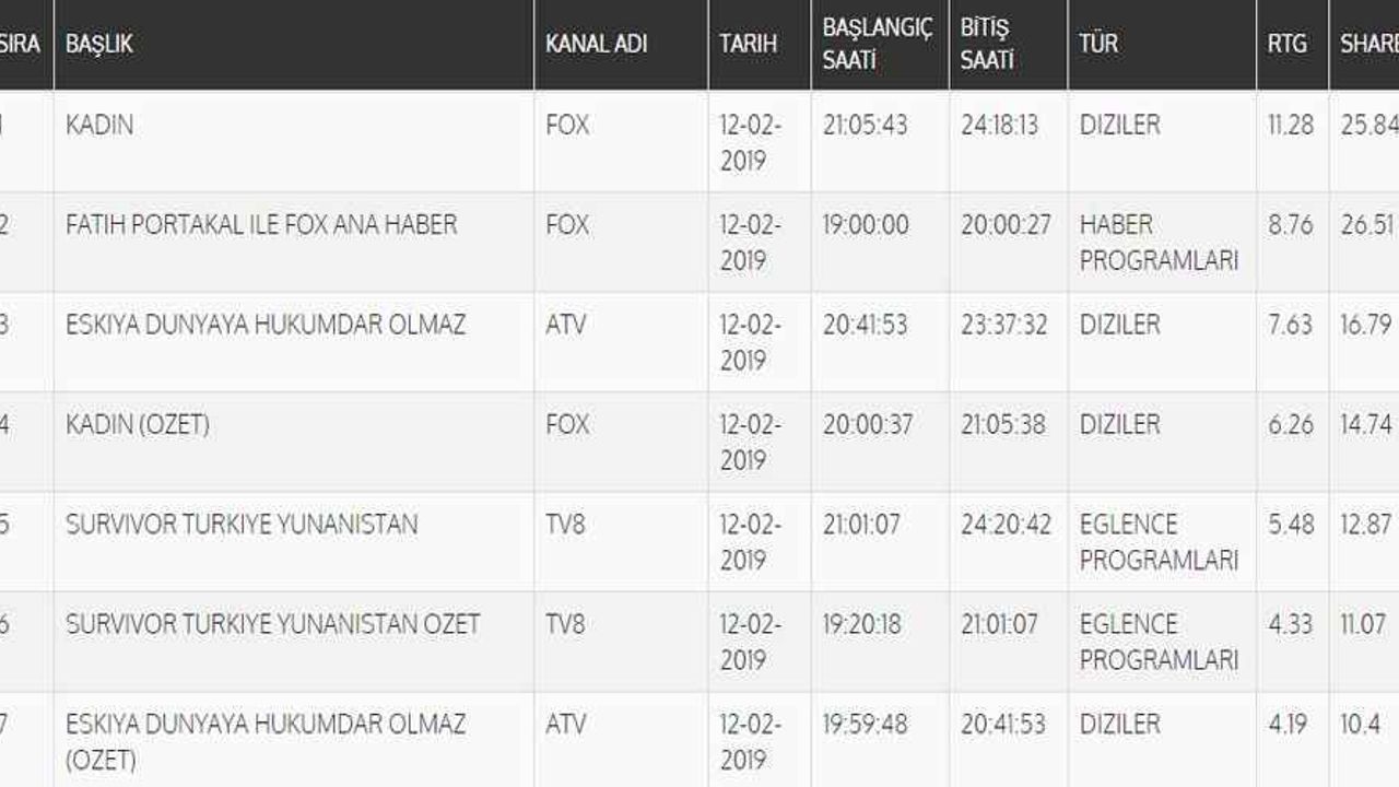 12 ŞUBAT 2019 REYTİNG SONUÇLARI