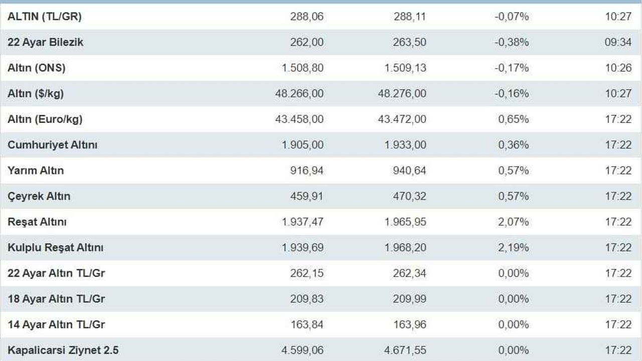 Gram altın güne 288,07 TL ile %0,09 değer kaybıyla devam ederken, çeyrek altın ise %0,57 değer artışıyla 470,32 TL satış fiyatı ile işlem görmektedir. 27 Aralık 2019 Cuma itibariyle altının güncel alış satış fiyatları: