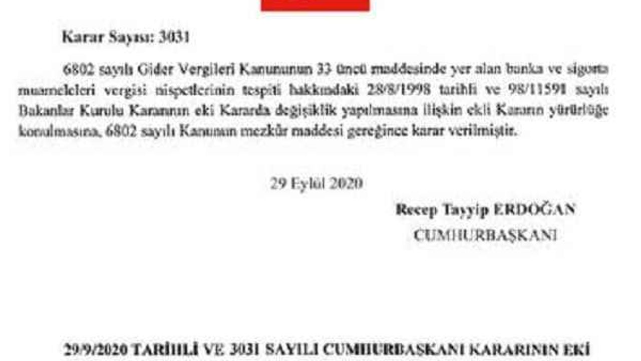 Cumhurbaşkanlığı kararında 6802 sayılı Gider Vergileri Kanunu’nun 33’üncü maddesinde yer alan BSMV nispetlerine ilişkin 28.08.1998 tarihli Bakanlar Kurulu Kararı’nın eki Kararın 1’inci maddesinin 1’inci fıkrasının e bendinde yer alan yüzde 1 ibaresinin binde 2 olarak değiştirildiği bildirildi.