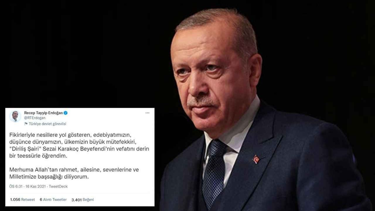 Cumhurbaşkanı Recep Tayyip Erdoğan, resmi Twitter hesabından yaptığı paylaşımda 88 yaşında ebediyete göç eden şair, yazar ve fikir adamı Sezai Karakoç için taziye mesajı yayımlandı.